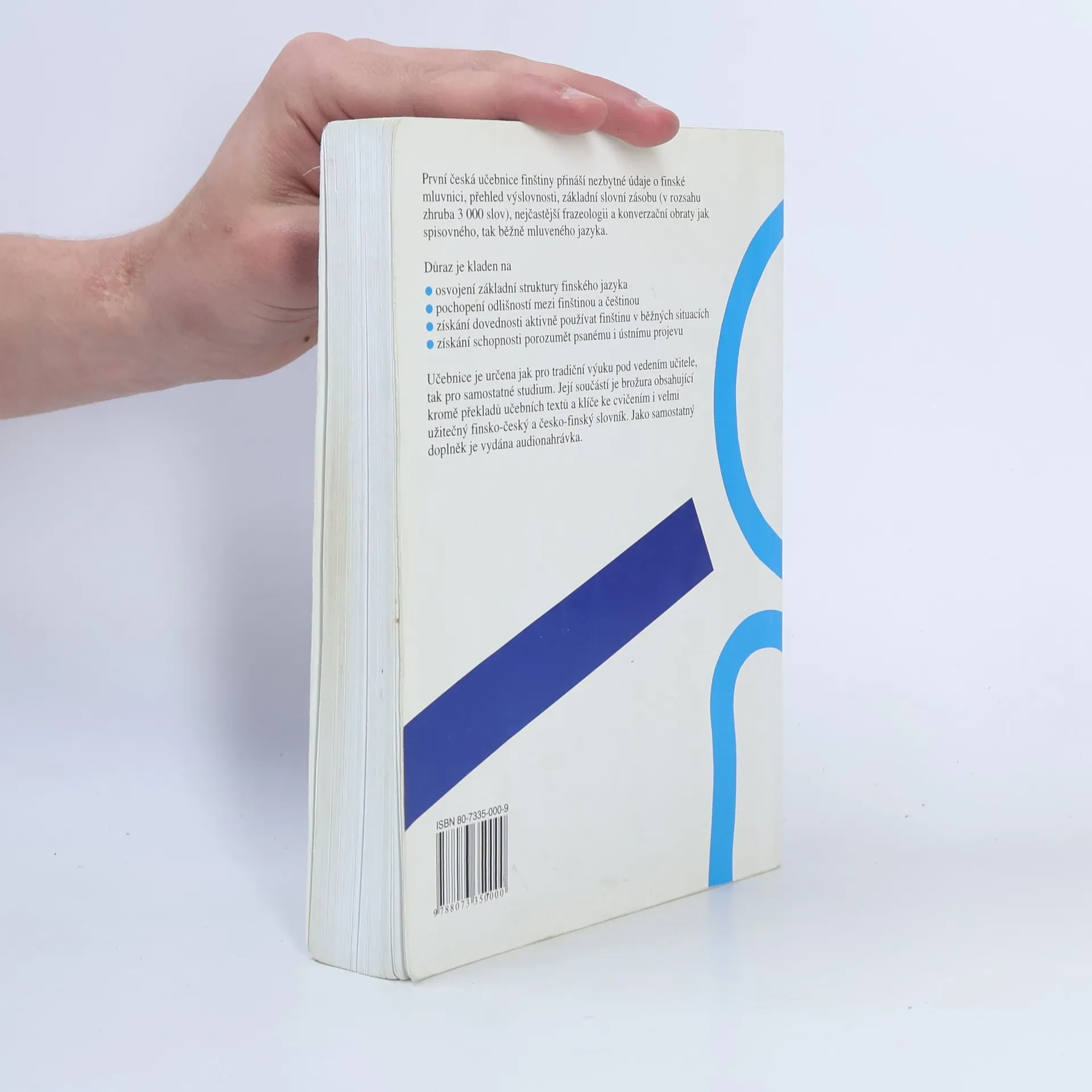 První učebnice finského jazyka v češtině nabízí v 31 lekcích úplné základy současné finštiny. Je určena především pro kursy pod vedením učitele, který může doplňovat a rozvádět vše, co – ve snaze pojmout do knihy co nejvíce – mohlo být naznačeno nebo procvičeno jen stručně. Svým uspořádáním je však vhodná i pro samouky. Součástí učebnice je slovník finsko-český obsahující zhruba 3000 hesel a česko-finský o rozsahu zhruba 1000 hesel, dále klíč s řešením cvičení v lekcích a s českými překlady textů a rozhovorů ze všech lekcí.