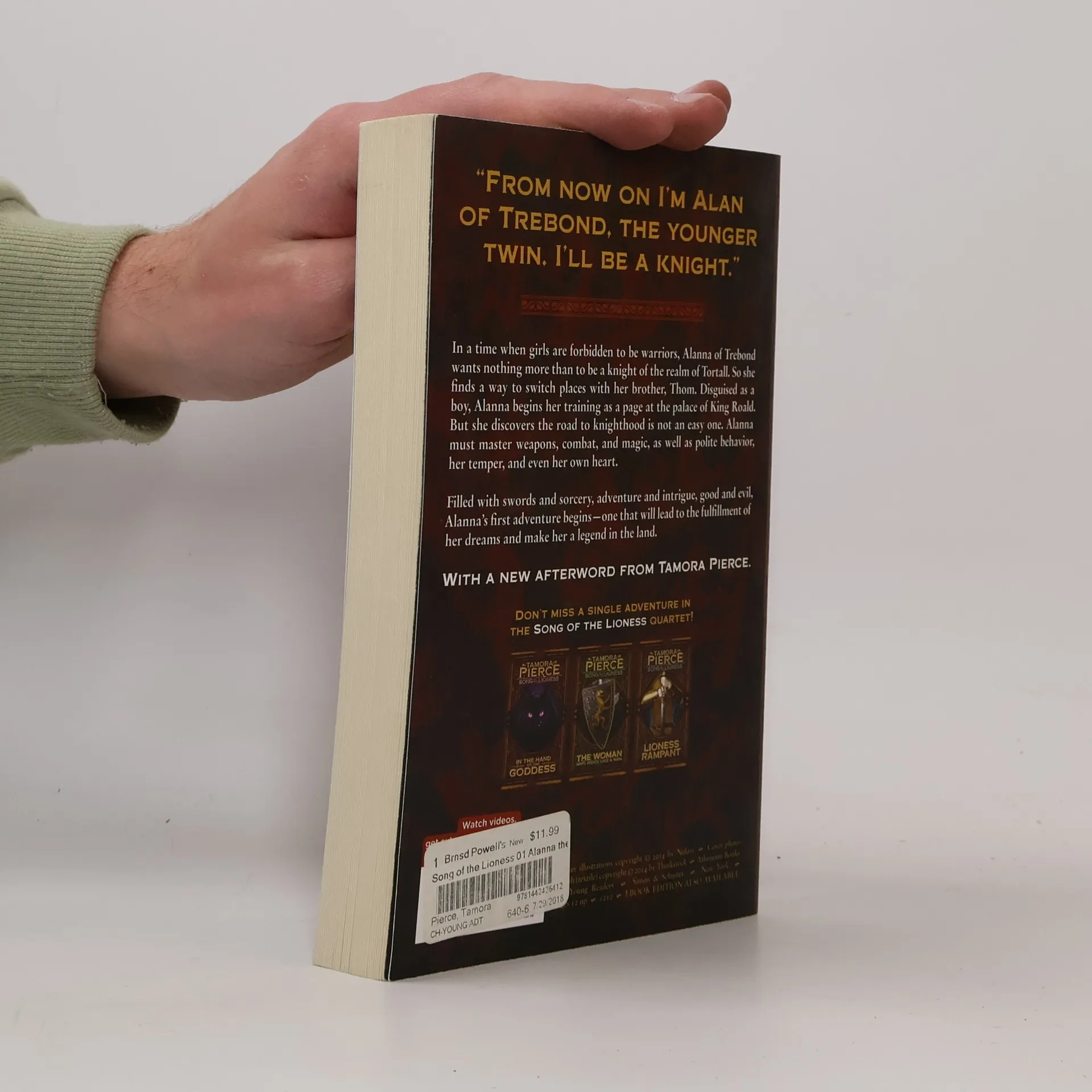 From Tamora Pierce, the first book in the Song of the Lioness Quartet, honored with the Margaret A. Edwards Award. “From now on I’m Alan of Trebond, the younger twin. I’ll be a knight.” In a time when girls are forbidden to be warriors, Alanna of Trebond wants nothing more than to be a knight of the realm of Tortall. So she finds a way to switch places with her twin brother, Thom. Disguised as a boy, Alanna begins her training as a page at the palace of King Roald. But the road to knighthood, as she discovers, is not an easy one. Alanna must master weapons, combat, and magic, as well as polite behavior, her temper, and even her own heart. Filled with swords and sorcery, adventure and intrigue, good and evil, Alanna’s first adventure begins—one that will lead to the fulfillment of her dreams and make her a legend in the land.