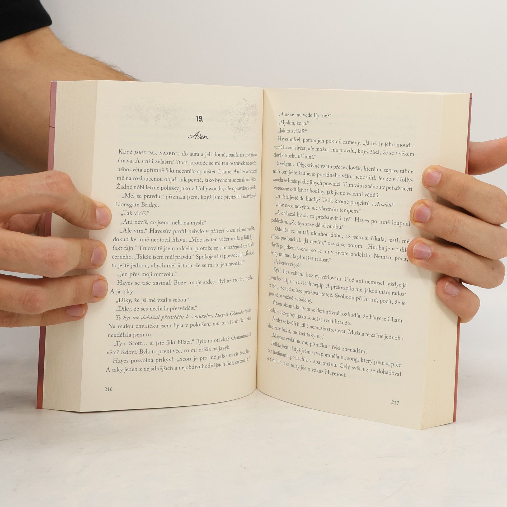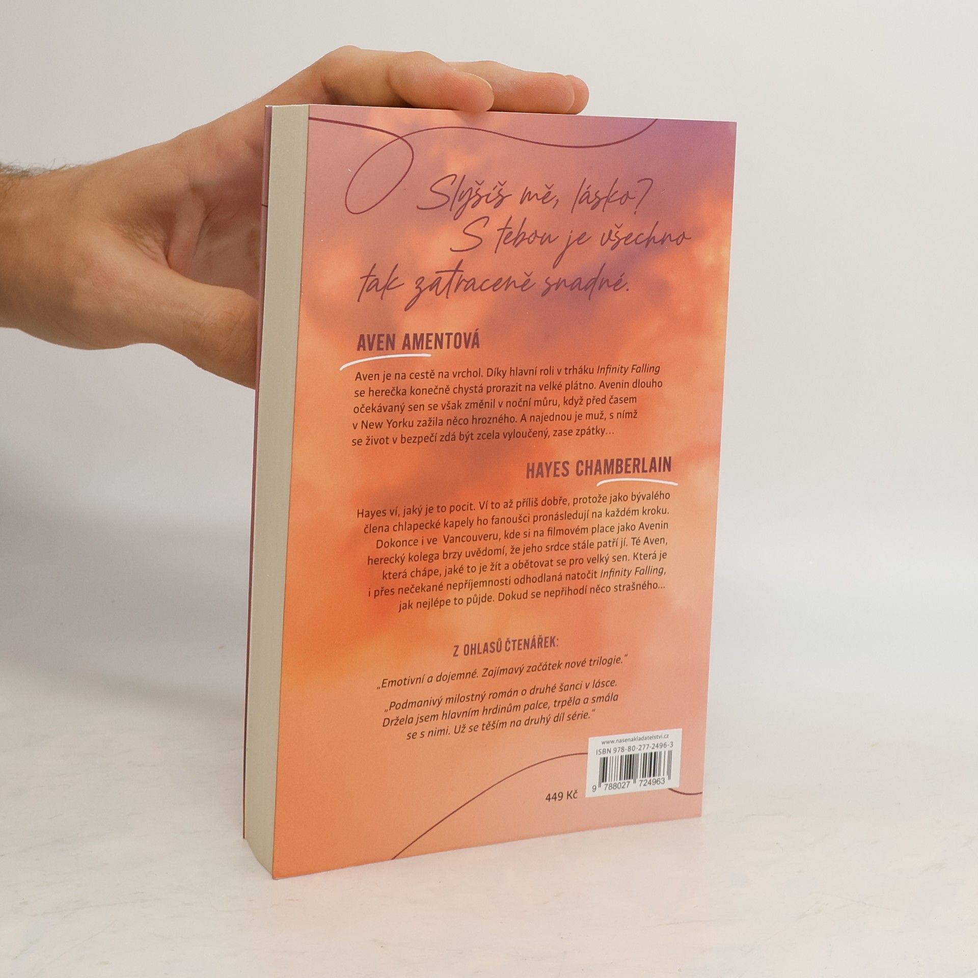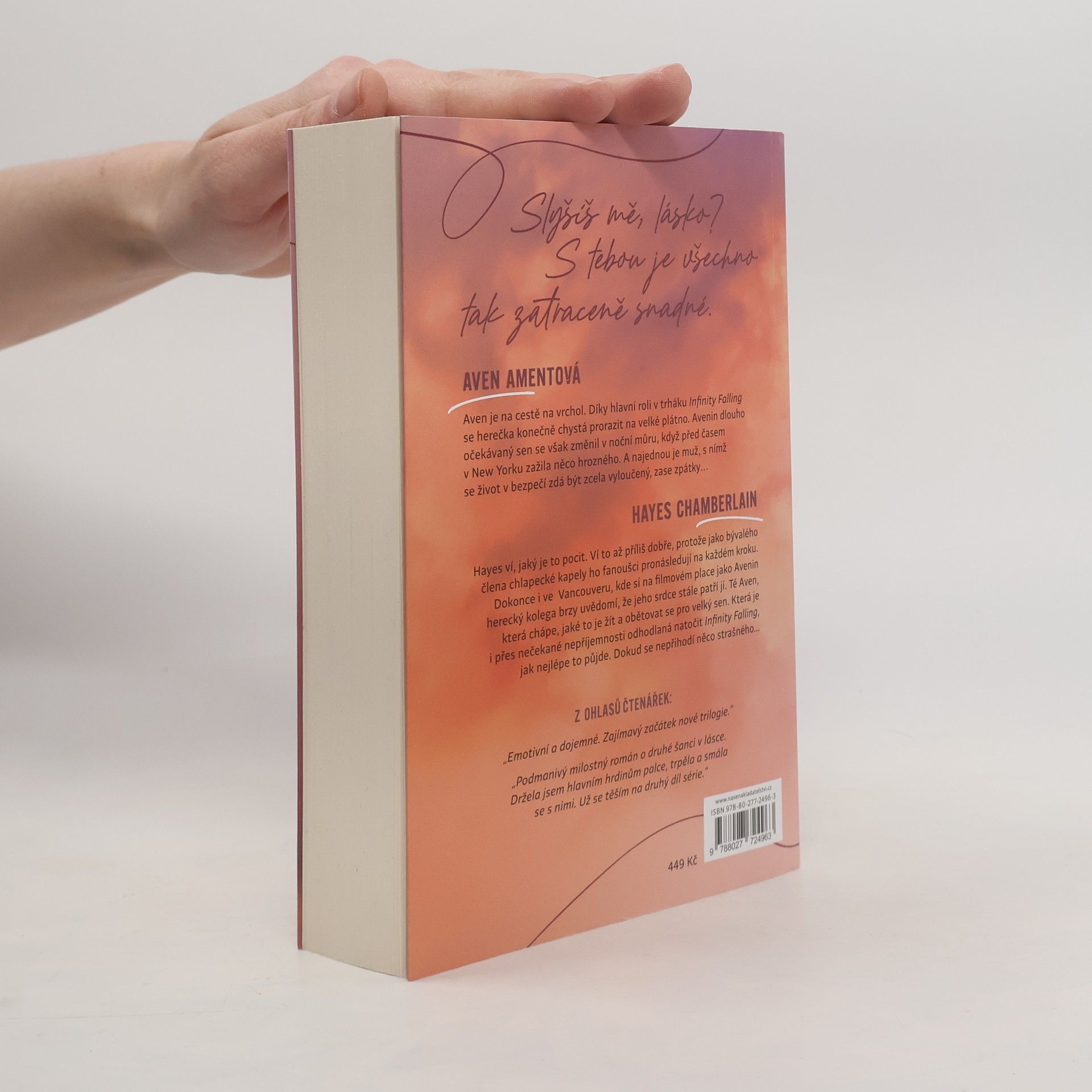 Milostný román o druhé šanci na lásku. Aven Amentová má hrát hlavní roli v chystaném filmu a jejím hereckým kolegou je její dávný známý. Může stará jiskra vášně opět vzplanout? Vycházející hvězda americké herecké scény Aven Amentová přijme hlavní roli v nové dystopické sérii Infinity Falling a přestěhuje se za natáčením do Vancouveru. Její herecký kolega ale nečekaně onemocní a hlavní mužské role po jejím boku se ujímá miláček fanoušků Hayes Chamberlain, který má však s herectvím jen pramalé zkušenosti. Tenhle bývalý frontman britské chlapecké kapely Temporary Fix má s Aven z minulosti nevyřízené účty. Ji navíc sužuje stalkerka z řad fanoušků, která se dokáže vetřít všude a ohrožuje její psychickou pohodu. I Hayes je ale soukolím šoubyznysu poznamenaný a sklouzává k anorexii, s níž se dříve léčil. Zvládnou ti dva ve filmu zahrát ústřední milostnou dvojici? Dokážou se zbavit svých vnitřních démonů a najít k sobě pod drtivým tlakem médií a fandů opět cestu? Má vztah šanci vydržet v reálném životě? Nakladatelská anotace. Kráceno.