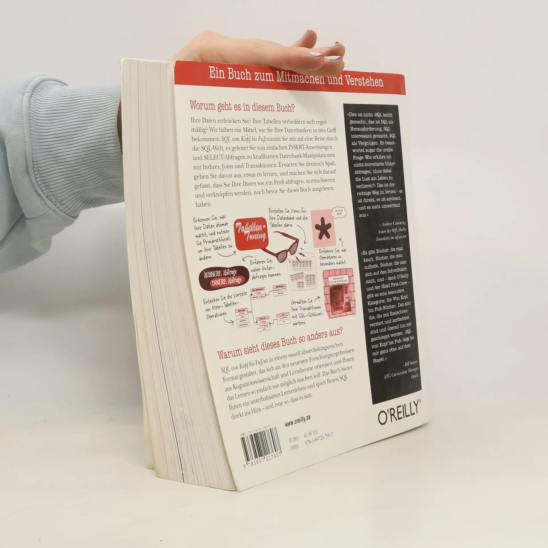 Ihre Daten erdrücken Sie? Ihre Tabellen verheddern sich regelmäßig? Wir haben ein Mittel, wie Sie Ihre Datenbanken in den Griff bekommen: SQL von Kopf bis Fuß nimmt Sie mit auf eine Reise durch die SQL-Welt, es geleitet Sie von einfachen INSERT-Anweisungen und SELECT-Abfragen zu knallharten Datenbank-Manipulationen mit Indizes, Joins und Transaktionen. Erwarten Sie dennoch Spaß, gehen Sie davon aus, etwas zu lernen, und machen Sie sich darauf gefasst, dass Sie Ihre Daten wie ein Profi abfragen, normalisieren und verknüpfen werden, noch bevor Sie dieses Buch ausgelesen haben. SQL von Kopf bis Fuß ist in einem visuell abwechslungsreichen Format gestaltet, das sich an den neuesten Forschungsergebnissen aus Kognitionswissenschaft und Lerntheorie orientiert und Ihnen das Lernen so einfach wie möglich machen soll. Das Buch bietet Ihnen ein unterhaltsames Lernerlebnis und spielt Ihnen SQL direkt ins Hirn - und zwar so, dass es sitzt.