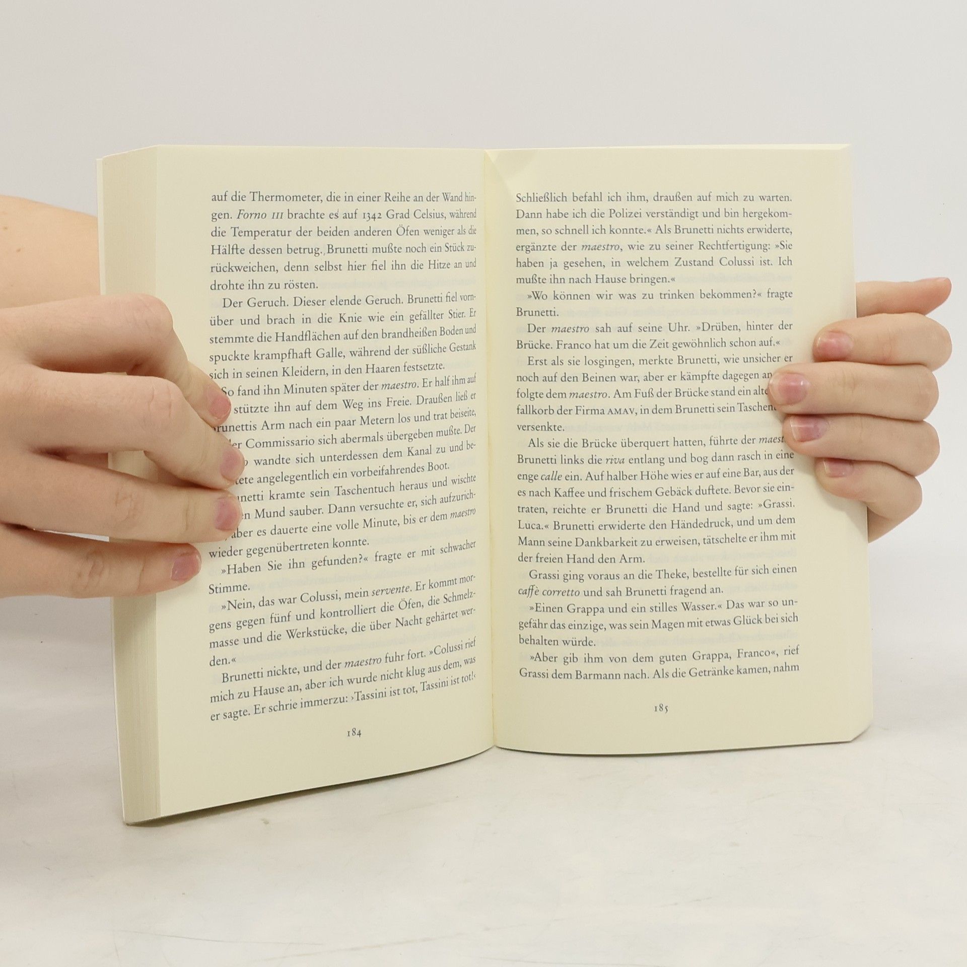 Tod vor dem Brennofen. Ist ein Familienzwist zwischen dem Fabrikbesitzer und seinem Schwiegersohn schuld? Oder musste der Nachtwächter der Glasmanufaktur dafür büßen, dass er ein fanatischer Umweltschützer und Leser ist? In einer Ausgabe von Dantes Inferno entdeckt Brunetti die entscheidende Spur.