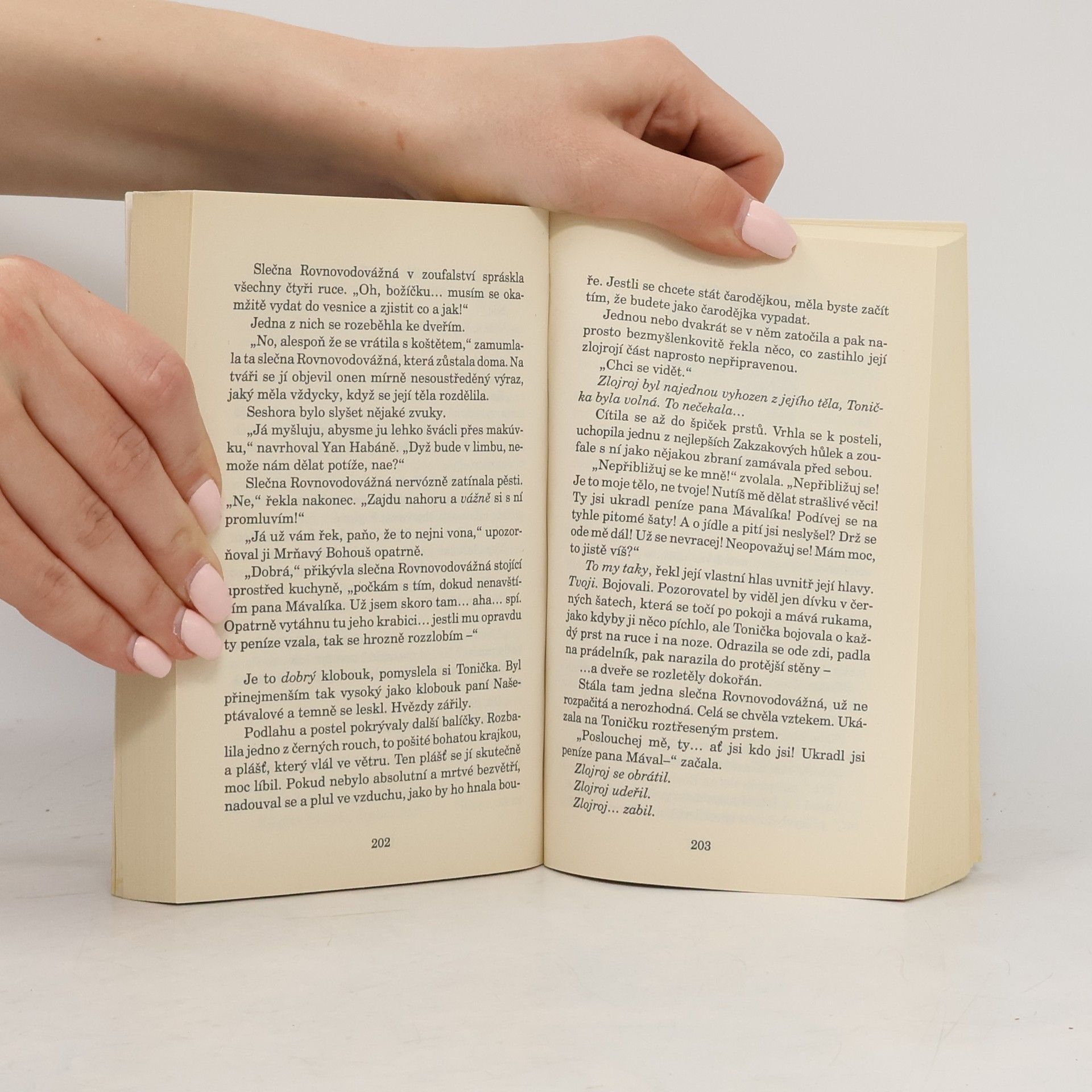 Hlavní hrdinkou této knížky je už 11letá Tonička Bolavá z Křídy, která se dva roky poté, co zjistila, že má talent pro čarování, vydává do učení. Dostává se ke slečně Rovnovodovážné v horách, kde se učí každodennímu řemeslu čarodějek, spočívajícím v obyčejné pomoci ostatním lidem. To se ale brzo mění, protože se jí snaží vystopovat nebezpečný zlojroj, jenž chce ovládnout její mysl i tělo. V nejhorších chvílích jí naštěstí pomůžou nejen její známí Nac mac Fíglové, ale také Bábi Zlopočasná, nejlepší čarodějka (i když čarodějky žádné náčelnice nemají) Zeměplochy. Tonička tak získá nejenom respekt okolí a přátelství Esmé Zlopočasné (což budí úctu všech ostatních čarodějek včetně Toniččiných kamarádek), ale také pochopí, co to znamená být skutečnou čarodějkou.
