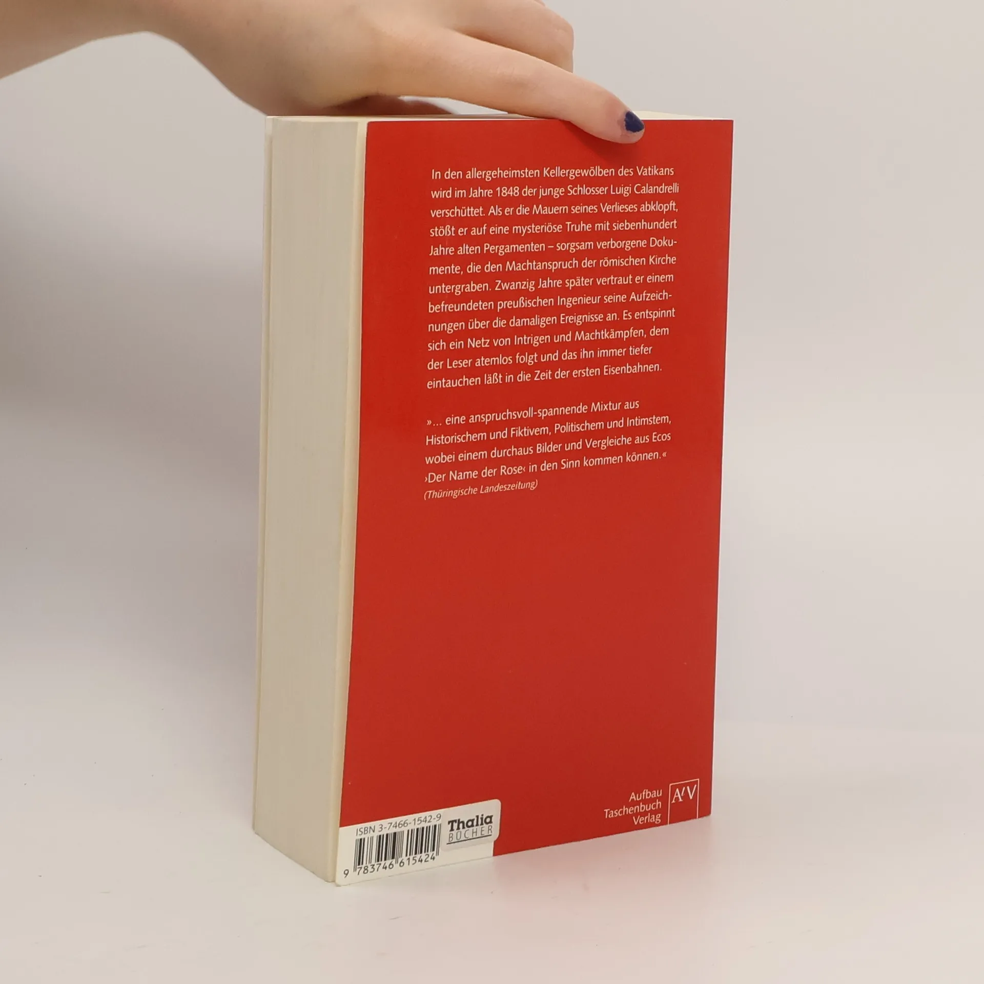 Ein historischer Thriller der Extraklasse Im Kellerlabyrinth des Vatikans wird im Jahre 1848 ein junger Schlosser verschüttet. Bei seinem Befreiungsversuch stößt er auf eine mysteriöse Truhe mit uralten Pergamenten, die den Machtanspruch der römischen Kirche untergraben. Als er zwanzig Jahre später einem Ingenieur seine Aufzeichnungen anvertraut, bringt er ihn damit in Lebensgefahr. „… eine anspruchsvoll-spannende Mixtur aus Historischem und Fiktivem, Politischem und Intimstem, wobei einem durchaus Bilder und Vergleiche aus Ecos ‚Der Name der Rose’ in den Sinn kommen können.“ Thüringische Landeszeitung