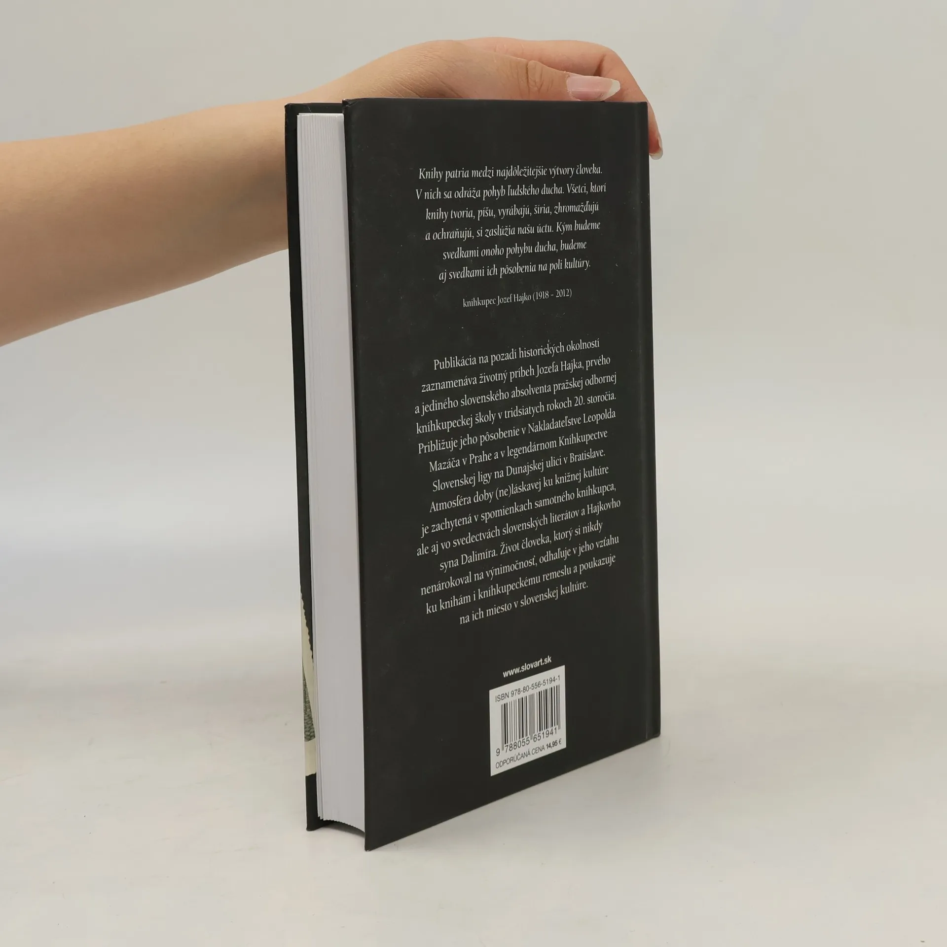 Publikácia na pozadí historických okolností zaznamenáva zlomky životného príbehu Jozefa Hajka, prvého a jediného slovenského absolventa pražskej odbornej kníhkupeckej školy v tridsiatych rokoch 20. storočia. Atmosféru doby a dobové reálie zachytáva prostredníctvom spomienok súčasníkov hlavnej postavy, ako aj autora tejto knihy, jeho syna Dalimíra. Život človeka, ktorý si nikdy nenárokoval na výnimočnosť, odhaľuje vo vzťahu k pohybom v našej kultúre, osobitne knižnej. Ide o pokus načrieť do dávnejších i menej dávnych vývinových súvislostí kníhkupeckého stavu, ako aj o pohľad na jeho miesto v kultúre národa a na proces etablovania v konkrétnom civilizačnom prostredí.