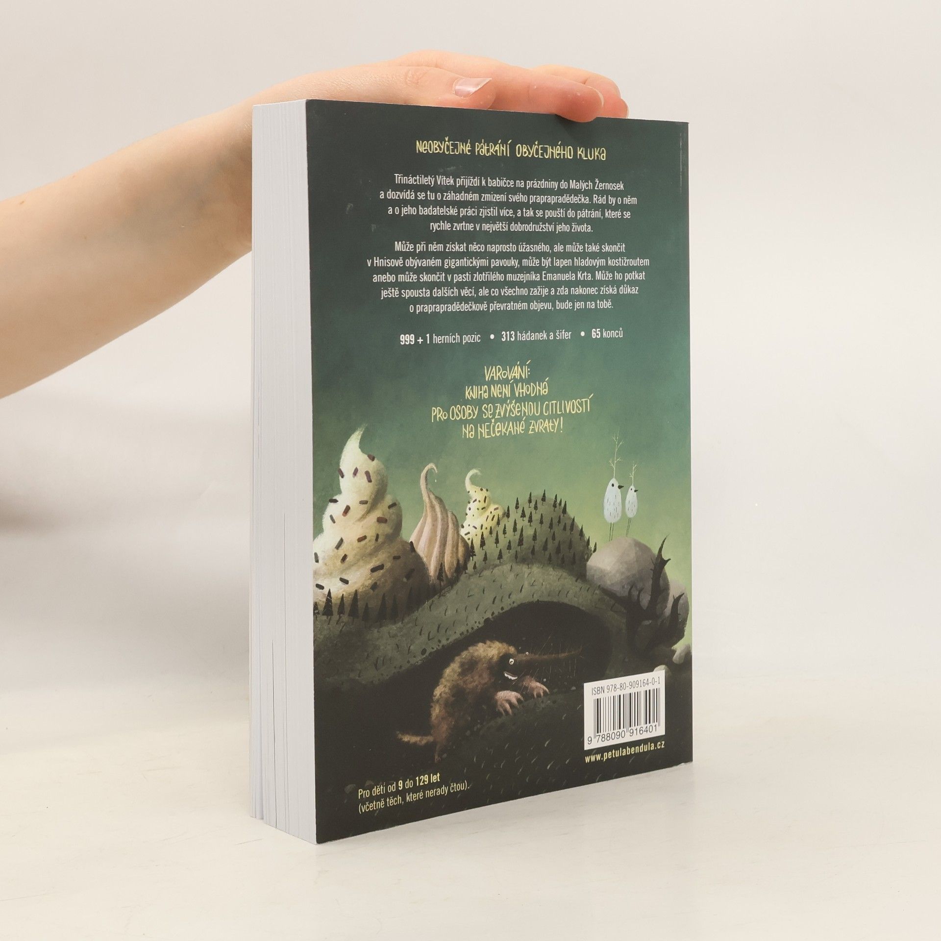 Třináctiletý Vítek přijíždí k babičce na prázdniny do Malých Žernosek a dozvídá se tu o záhadném zmizení svého praprapradědečka. Rád by o něm a o jeho badatelské práci zjistil více, a tak se pouští do pátrání, které se rychle zvrtne v největší dobrodružství jeho života. Může při něm získat něco naprosto úžasného, alemůže také skončit v Hnisově obývaném gigantickými pavouky, může být lapen hladovým kostižroutem anebo může skončit v pasti zlotřilého muzejníka Emanuela Krta. Může ho potkat ještě spousta dalších věcí, ale co všechno zažije a zda nakonec získá důkaz o praprapradědečkově převratném objevu, bude jen na tobě. Varování: Kniha není vhodná pro osoby se zvýšenou citlivostí na nečekané zvraty! Vhodné pro čtenáře a hráče ve věku 9–12(0) let, ale ještě vhodnější pro celou rodinu. Knížku si může užít každý sám, ale díky četným hádankám a šifrám je vhodná i jako společná aktivita pro rodiče s dětmi. I proto jsem se snažila text psát tak, aby bavil i dospělé.