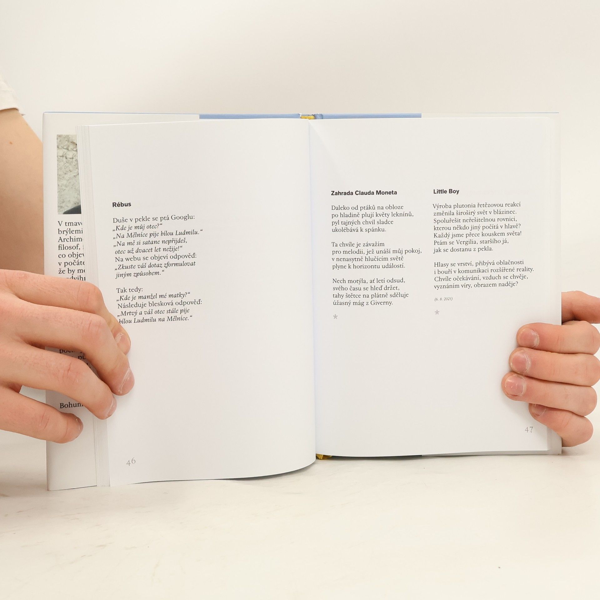 Každý má oči, aby viděl, a srdce, aby žil, ale měl by srdcem i vidět a nežít jen z toho, co oči vidí, jelikož často vidí jen to, co si člověk vidět přeje. Lidská existence se prolíná s dantovskou vizí pekla, očistce i ráje. Digicivilizace zavádí druh Homo sapiens do metavesmíru rozšířené virtuální reality, jejíž se máme stát součástí. Kam až to bude v nové civilizaci ještě člověk a odkud už to bude někdo jiný? V tmavomodré noci s růžovými brýlemi v partituře snu Archimedes ze Syrakus, filosof, fyzik a matematik co objevil páku, věřil v počátečním nadšení, že by mohl na jejím principu vyzdvihnout svět, jenže nemohl nalézt bod, o který by mohl páku opřít. Šel zamyšlen za vnitřním hlasem, ale chybělo mu něco, co by bylo schopno nést samo sebe a nebylo neseno ničím. Množinou hledaného bodu bylo myšlení, protože chceš-li pochopit vědomí, potřebuješ ideu, působící uvnitř ega. Nalézt svůj klid v neklidném světě. Grafickou podobu knihy vytvořil doc. ak. mal. Michal Slejška a ilustrační kresby jsou dílem ak. mal. Dimitrije Kadrnožky.