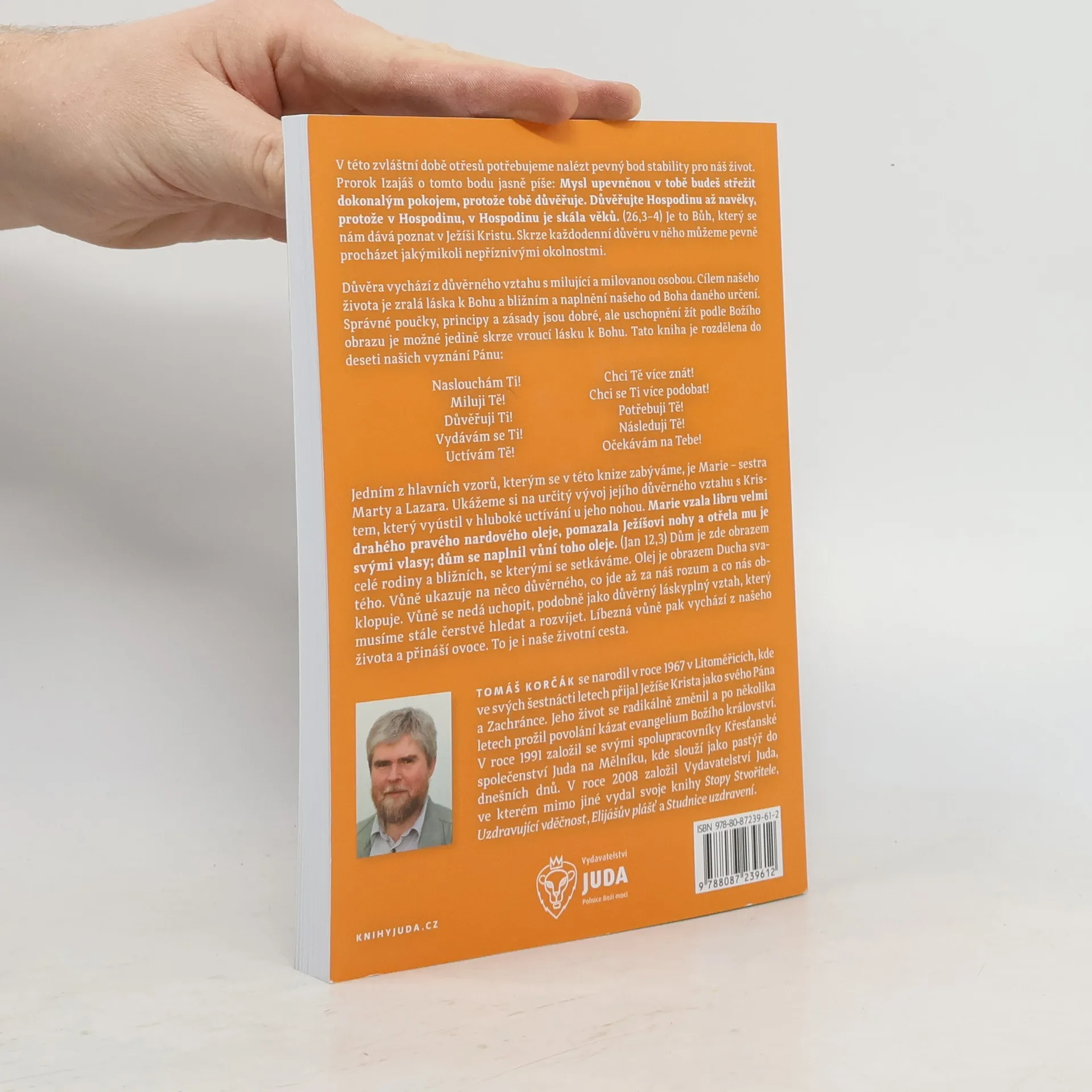 V této zvláštní době otřesů potřebujeme nalézt pevný bod stability. Prorok Izajáš hovoří o tom, že mysl upevněná v Bohu bude střežena dokonalým pokojem, protože mu důvěřuje. Důvěra v Hospodina, který se nám dává poznat v Ježíši Kristu, nám umožňuje procházet nepříznivými okolnostmi. Důvěra vychází z blízkého vztahu s milující osobou. Cílem našeho života je zralá láska k Bohu a bližním, naplnění našeho určení. I když jsou správné poučky a zásady důležité, žít podle Božího obrazu lze pouze skrze vroucí lásku k Bohu. Kniha se skládá z deseti vyznání Pánu, jako jsou "Naslouchám Ti!" a "Uctívám Tě!" Hlavním vzorem je Marie, sestra Marty a Lazara, jejíž důvěrný vztah s Kristem vyústil v hluboké uctívání. Pomazala Ježíšovi nohy drahým olejem a otřela mu je svými vlasy, čímž naplnila dům vůní. Dům symbolizuje rodinu a bližní, olej představuje Ducha svatého. Vůně ukazuje na důvěrný, láskyplný vztah, který musíme neustále hledat a rozvíjet. Tato líbezná vůně vychází z našeho života a přináší ovoce, což je naše životní cesta.