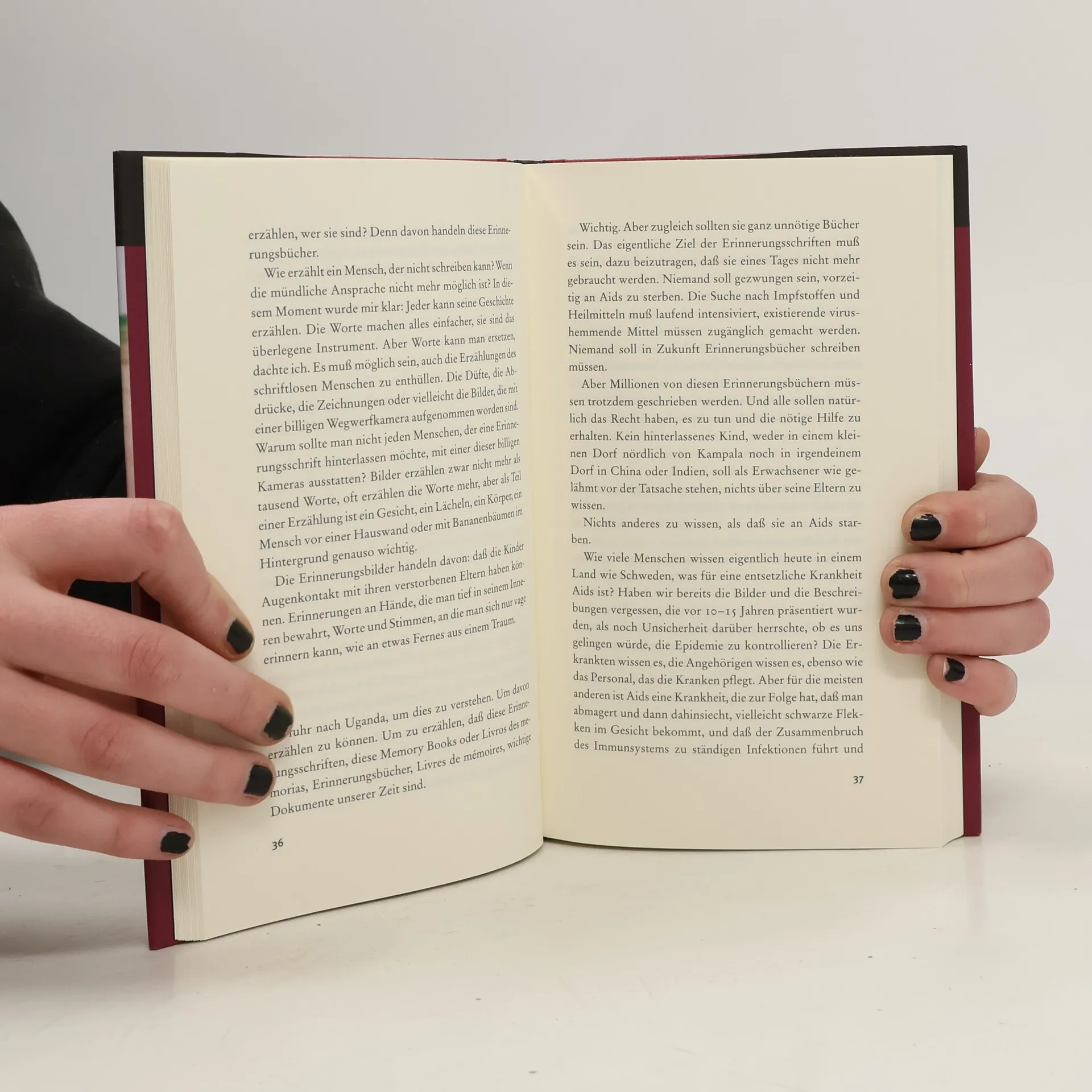 2003 ist Henning Mankell für einige Wochen nach Uganda gereist, um mit Aidskranken und deren Angehörigen zu sprechen. Entwicklungshelfer unterstützen die mit ihrem vorzeitigen Tod konfrontierten Eltern dabei, Erinnerungsbücher für ihre Kinder zu verfassen, in denen sie die wichtigsten Ereignisse ihres Lebens festhalten. Mankell schreibt in seinem sehr persönlichen Text über dieses Projekt und ruft zum Kampf gegen Aids in der Dritten Welt auf. Das Buch enthält im Anhang eine Beschreibung des Memory-Book-Projekts von Plan International in Uganda sowie den Abdruck eines übersetzten Memory-Books von Christine Aguga. Ein Nachwort der deutschen Gesundheitsministerin Ulla Schmidt zur Situation von Aids weltweit beschließt den Band.