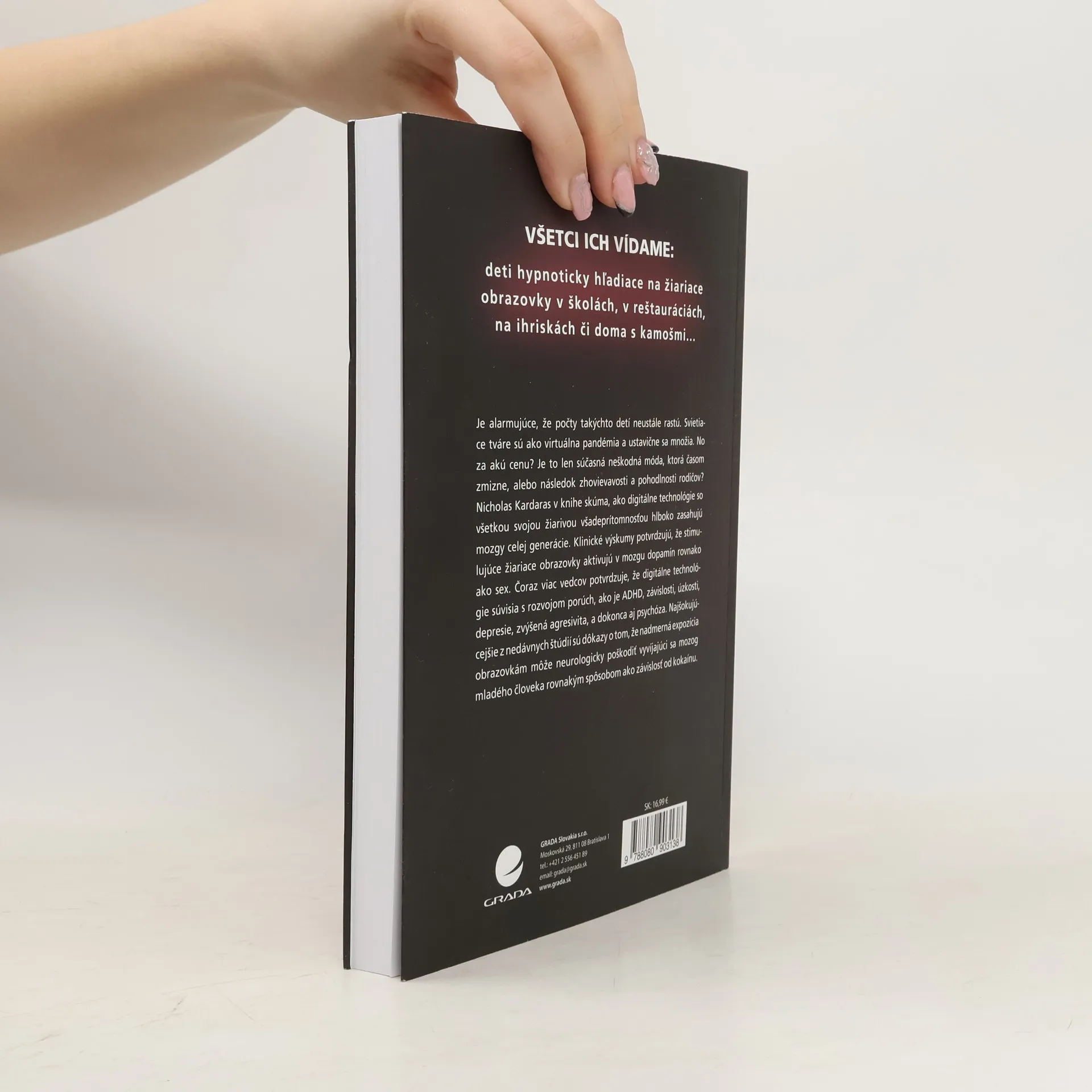 Všetci ich vídame: deti hypnoticky hľadiace na žiariace obrazovky v reštauráciách, na ihriskách či doma s kamošmi. Je alarmujúce, že počty takýchto detí neustále rastú. Svietiace tváre sú ako virtuálna pandémia a ustavične sa množia. No za akú cenu? Je to len súčasná neškodná móda, ktorá časom zmizne, alebo následok zhovievavostia pohodlnosti rodičov? Nicholas Kardaras v knihe skúma, ako digitálne technológie so všetkou svojou žiarivou všadeprítomnosťou hlboko zasahujú mozgy celej generácie. Klinické výskumy potvrdzujú, že stimulujúce žiariace obrazovky aktivujú v mozgu dopamín rovnako ako sex. Čoraz viac vedcov potvrdzuje, že digitálne technológie súvisia s rozvojom porúch, ako je ADHD, závislosti, úzkosti, depresie, zvýšená agresivita, a dokonca aj psychóza. Najšokujúcejšie z nedávnych štúdií sú dôkazy o tom, že nadmerná expozícia obrazovkám môže neurologicky poškodiť vyvíjajúci sa mozog mladého človeka rovnakým spôsobom ako závislosť od kokaínu.