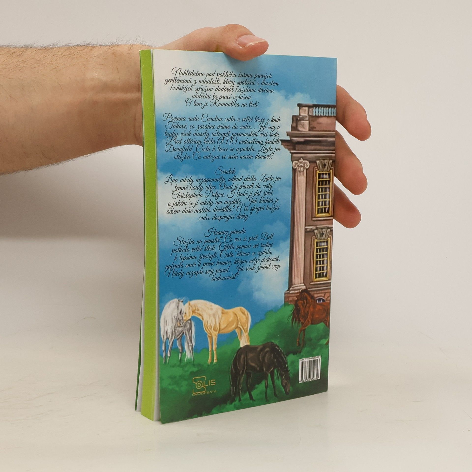 Nahlédněme pod pokličku šarmu pravých gentlemanů z minulosti, který společně s dusotem koňských spřežení dodával každému dívčímu nádechu to pravé vzrušení. O tom je Romantika na třetí: Povinna rodu Caroline snila o velké lásce z knih. Takové, co zasáhne přímo do srdce. Její sny a touhy však musely ustoupit povinnostem vůči rodu. Před oltářem řekla ANO ovdovělému hraběti Dornfield. Cesta k lásce se uzavřela. Zbyla jen otázka Co nalezne ve svém novém domově? Sirotek Lina nikdy nezapomněla, odkud přišla. Znala jen temné kouty ulice. Osud jí přivedl do cesty Christophera Detyre. Hrabě jí dal život, o jakém se jí nikdy ani nezdálo. Jak křehká je ovšem duše malého děvčátka? A co skrývá toužící srdce dospívající dívky? Hranice původu Služba na panství? Co více si přát. Bell potkalo velké štěstí. Chtěla pomoci své rodině k lepšímu živobytí. Cesta, kterou se vydala, nabrala směr k pevné hranici, kterou nelze překonat. Nikdy nezapře svůj původ. Jde však změnit svoji budoucnost?