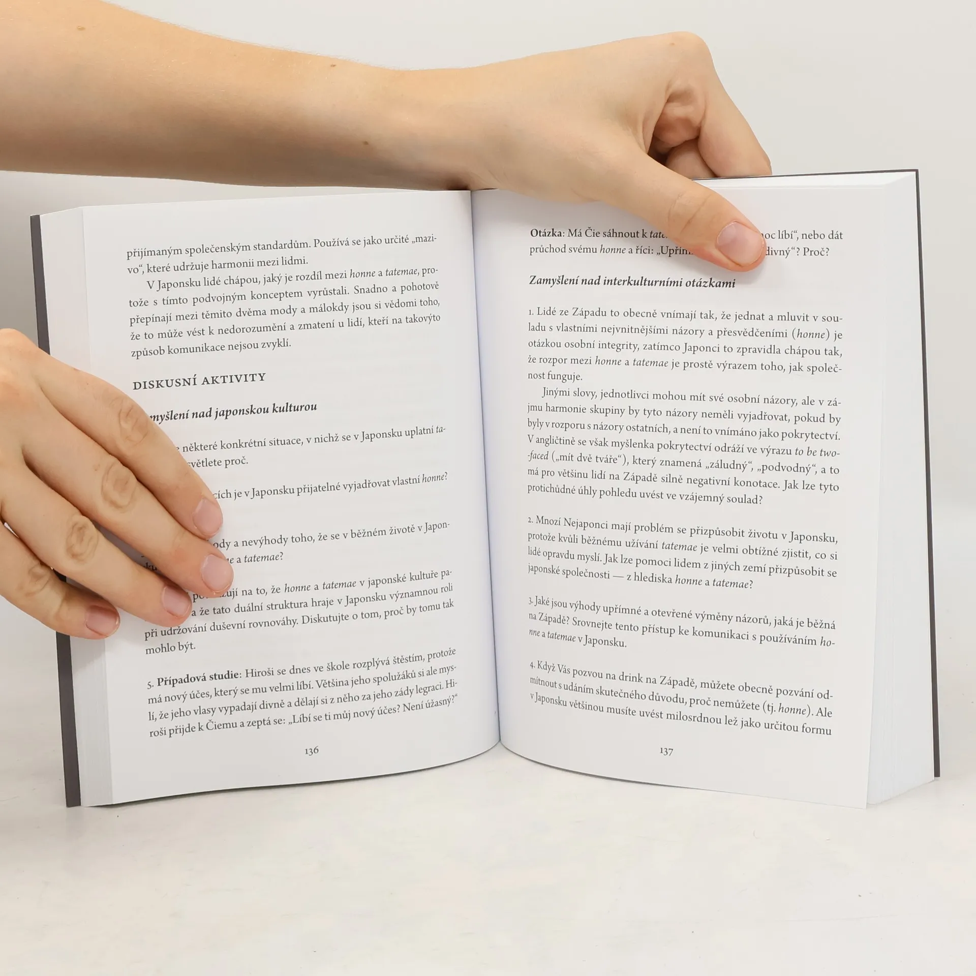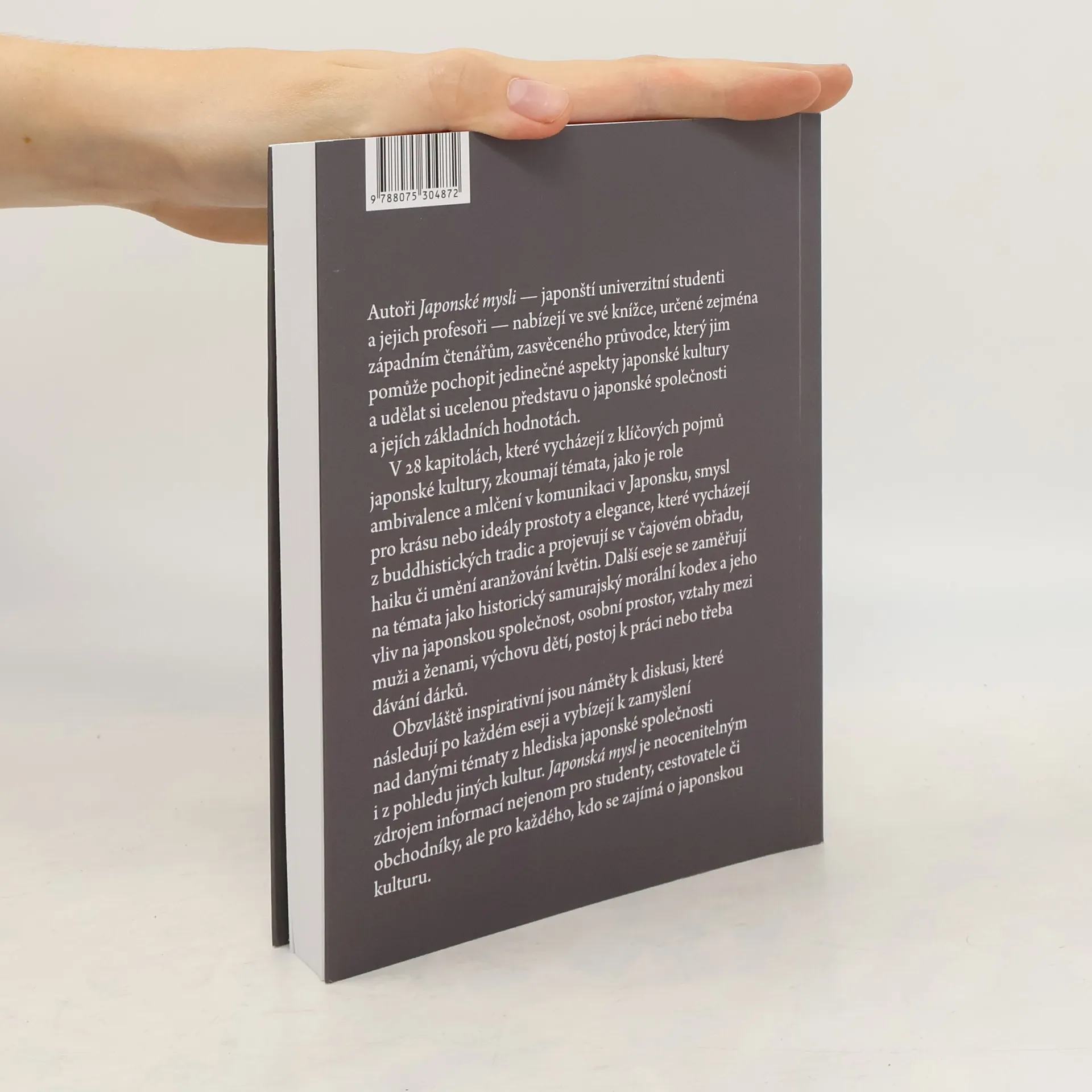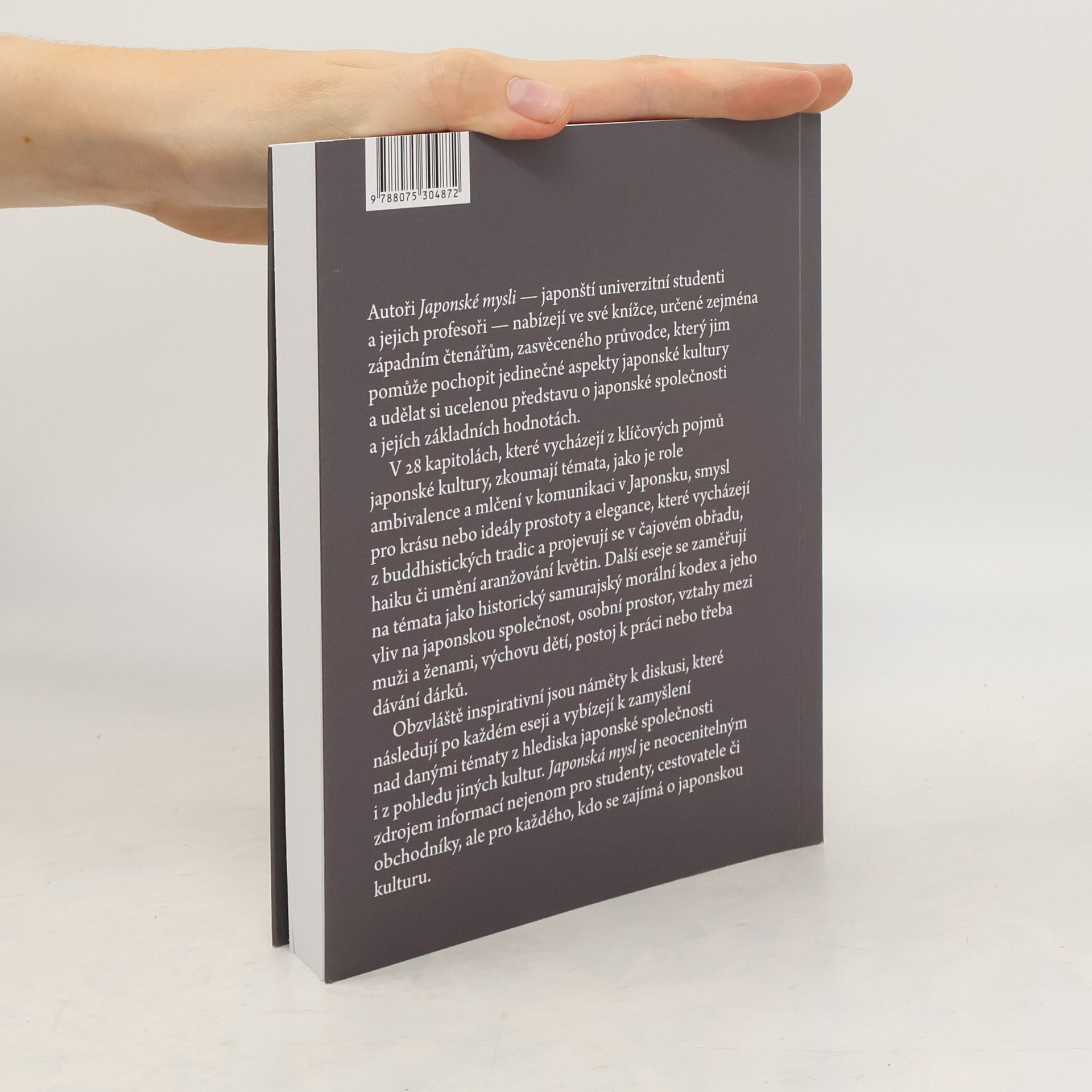 V knize Japonská mysl nabízí autoři západním čtenářům zasvěceného průvodce, který jim pomůže pochopit jedinečné aspekty japonské kultury. Čtenáři této knihy získají ucelenou představu o japonské společnosti a jejích základních hodnotách. Mezi zkoumaná témata patří: aimai (nejednoznačnost), amae (závislost na laskavosti druhých) a amakudari (sestup z nebe), činmoku (mlčení v komunikaci), gambari (vytrvalost) a giri (společenská povinnost). haragei (doslova "umění břicha"; implicitní, nevyslovená komunikace), kenkjó (zdání skromnosti) wabi-sabi (jednoduchost a elegance) a zótó (dávání darů). a také diskuse o výchově dětí, osobním prostoru a rolích žen v japonské společnosti. Díky námětům k diskusi a otázkám za každou kapitolou je tato kniha snadno použitelným úvodem do charakteristických rysů japonské společnosti a neocenitelným zdrojem informací pro každého - obchodníky, cestovatele nebo studenty - a nakonec pro každého, kdo se zajímá o japonskou kulturu.