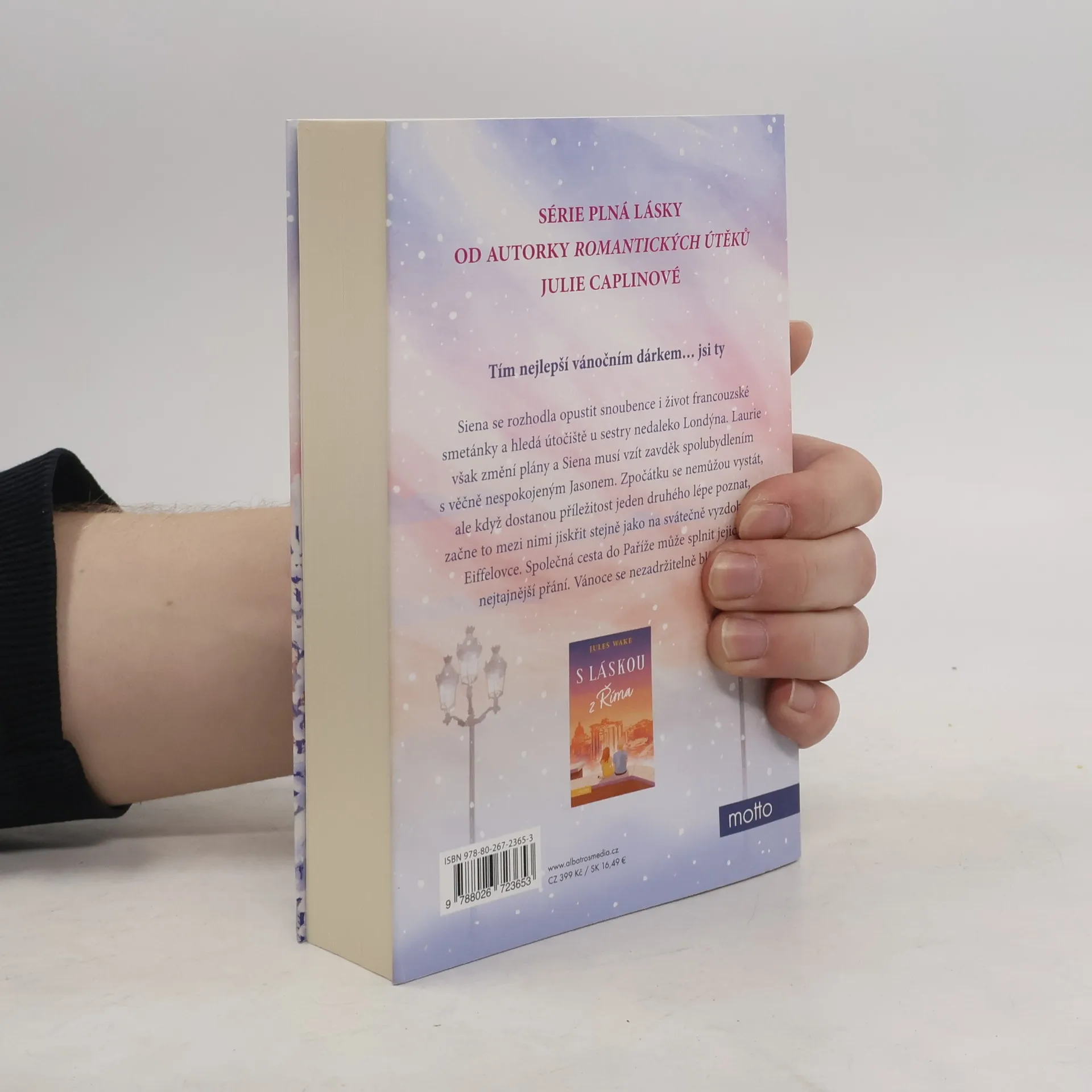 Tím nejlepší vánočním dárkem… jsi ty Siena se rozhodla opustit snoubence i život francouzské smetánky a hledá útočiště u sestry nedaleko Londýna. Ta však změní plány a Siena musí vzít zavděk spolubydlením s věčně nespokojeným Jasonem. Zpočátku se nemůžou vystát, ale když dostanou příležitost jeden druhého lépe poznat, začne to mezi nimi jiskřit stejně jako na svátečně vyzdobené Eiffelovce. Společná cesta do Paříže může splnit jejich nejtajnější přání. Vánoce se nezadržitelně blíží…Román plný lásky od autorky Romantických útěků Julie Caplinové píšící pod jménem Jules Wake.Paříž je pro mnohé nejromantičtějším městem na světě, ale Siena z francouzské metropole prchá před panovačnou matkou a snoubencem, kterého více než láska zajímá byznys a společenské postavení. Útočiště hledá u sestry nedaleko Londýna, ale Laurie změnila plány, a tak Sieně dělá společnost věčně nespokojený Jason. Společné bydlení je pro oba velkou komplikací, ale postupem času si jeden na druhého zvykají. Jejich původně pracovní víkend v Paříži se promění ve chvíle plné touhy. Od Sieny se ovšem očekává, že se vrátí do Francie. Vánoce jsou však časem splněných přání, ne povinností. A její sen může splnit jedině Jason. Ten se však do vztahu se ženou, která nemá vyřešenou minulost, nehrne. Je nejvyšší čas ujasnit si priority a začít doopravdy žít.