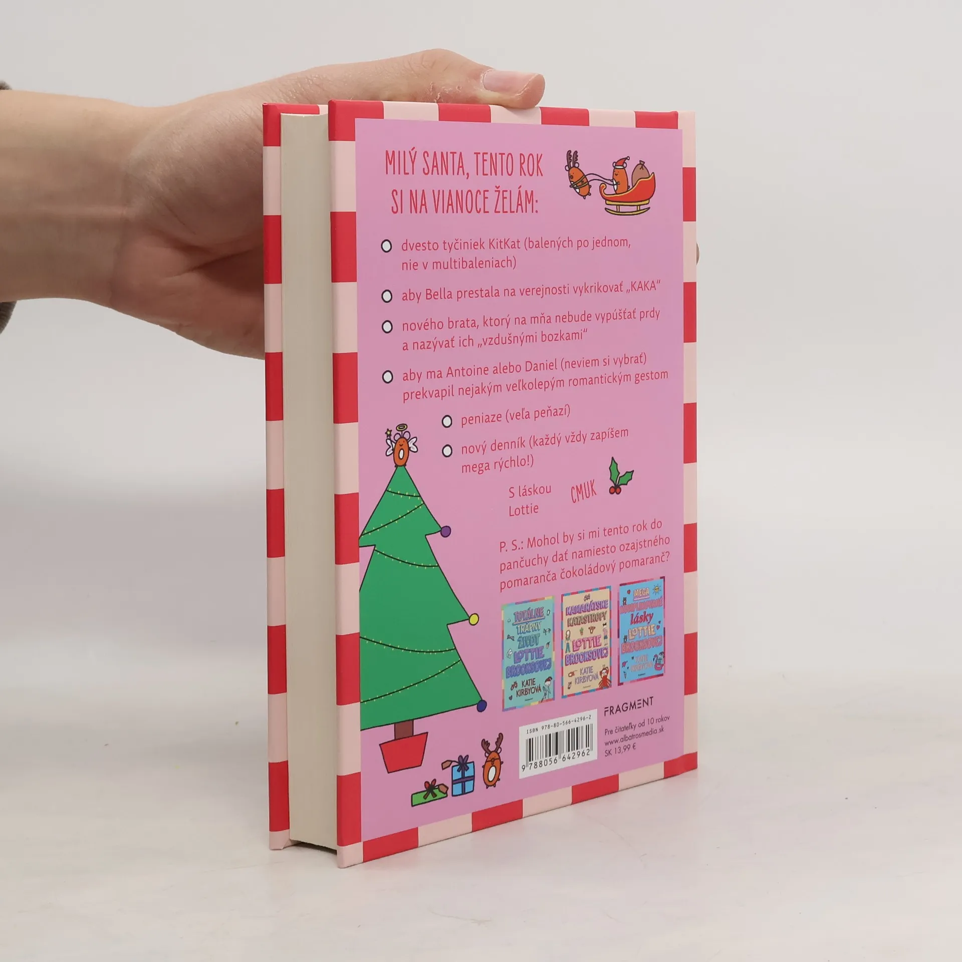 Moriačia maska, trblietavé hovienko, zmasakrovaný vianočný škriatok... ALE nakoniec dopadne všetko (celkom) dobre MILÝ SANTA, tento rok si na Vianoce želám: - dvesto tyčiniek KitKat (balených po jednom, nie v multibaleniach) - aby Bella prestala na verejnosti vykrikovať „KAKA“ - nového brata, ktorý na mňa nebude vypúšťať prdy a nazývať ich „vzdušnými bozkami“ - aby ma Antoine alebo Daniel (neviem si vybrať) prekvapil nejakým veľkolepým romantickým gestom - peniaze (veľa peňazí) - nový denník (každý vždy zapíšem mega rýchlo!) S láskou, Lottie Cmuk P. S.: Mohol by si mi tento rok do pančuchy dať namiesto ozajstného pomaranča čokoládový pomaranč?