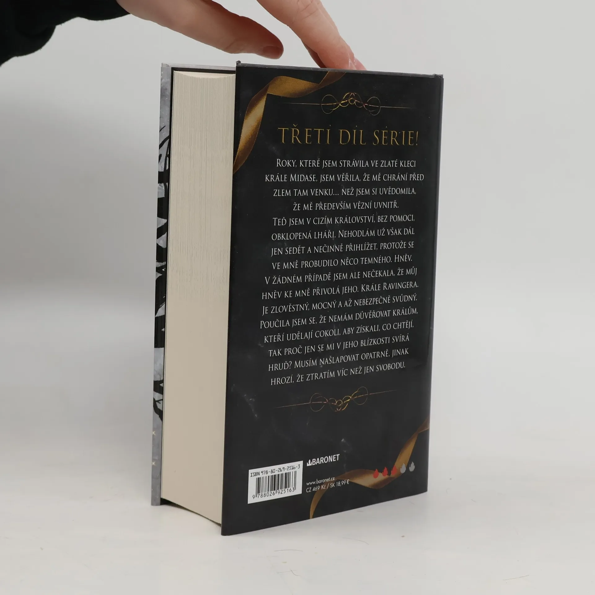 Třetí díl fantasy série Zlatá klec! Roky, které jsem strávila ve zlaté kleci krále Midase, jsem věřila, že mě chrání před zlem tam venku… než jsem si uvědomila, že mě především vězní uvnitř. Teď jsem v cizím království, bez pomoci, obklopená lháři. Nehodlám už však dál jen sedět a nečinně přihlížet, protože se vemně probudilo něco temného. Hněv. V žádném případě jsem ale nečekala, že můj hněv ke mně přivolá jeho. Krále Ravingera. Je zlověstný, mocný a až nebezpečně svůdný. Poučila jsem se, že nemám důvěřovat králům, kteří udělají cokoli, aby získali, co chtějí, tak proč jen se mi v jeho blízkosti svírá hruď? Musím našlapovat opatrně, jinak hrozí, že ztratím víc než jen svobodu.