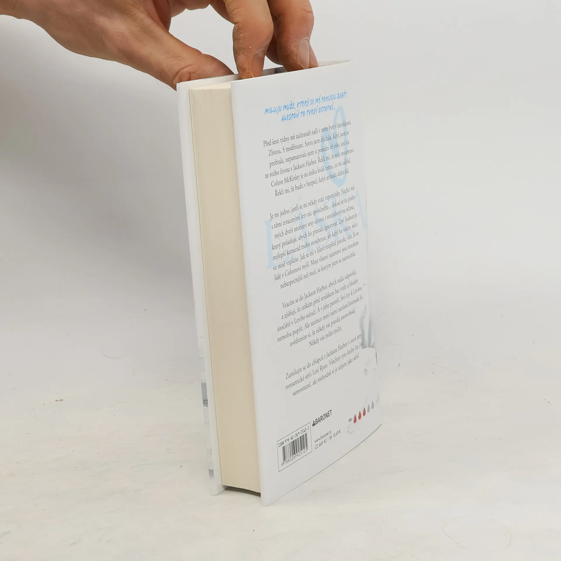 Miluju muže, který se mě pokusil zabít. Alespoň to tvrdí ostatní… Před šesti týdny mě záchranáři našli v mém bytě v bezvědomí. Zbitou. S modřinami. Sotva jsem dýchala. Když jsem se probrala, nepamatovala jsem si poslední tři roky, ani nic ze svého života v Jackson Harbor. Řekli mi, že můj snoubenec Colton McKinley je na útěku kvůli tomu, co mi udělal. Řekli mi, že budu v bezpečí, když se budu držet dál. Je mi jedno, jestli se mi někdy vrátí vzpomínky. Nechci mít s těmi ztracenými lety nic společného... dokud se na prahu mých dveří neobjeví sexy cizinec s rozzlobenýma očima, který požaduje, abych ho přestala ignorovat. Levi Jackson je nejlepší kamarád mého snoubence, ale když ho vidím, něco ve mně vzplane. Jak se mi v hlavě rozplétá pravda, vím, že se lidé v Coltonovi mýlí. Moje vlastní tajemství jsou mnohem nebezpečnější než muž, se kterým jsem se zasnoubila. Vracím se do Jackson Harbor, abych našla odpovědi, a zjišťuji, že utíkám před strašákem bez tváře a hledám útočiště v Leviho náručí. A v jeho posteli. Své city k Levimu nemohu popřít. Ale zatímco mezi námi narůstá hromada lží, uvědomím si, že někdy vás pravda neosvobodí. Někdy vás může zničit. Zamilujte se do chlapců z Jackson Harbor v nové sexy romantické sérii Lexi Ryan. Všechny tyto knihy lze číst samostatně, ale rozhodně si je užijete jako sérii!