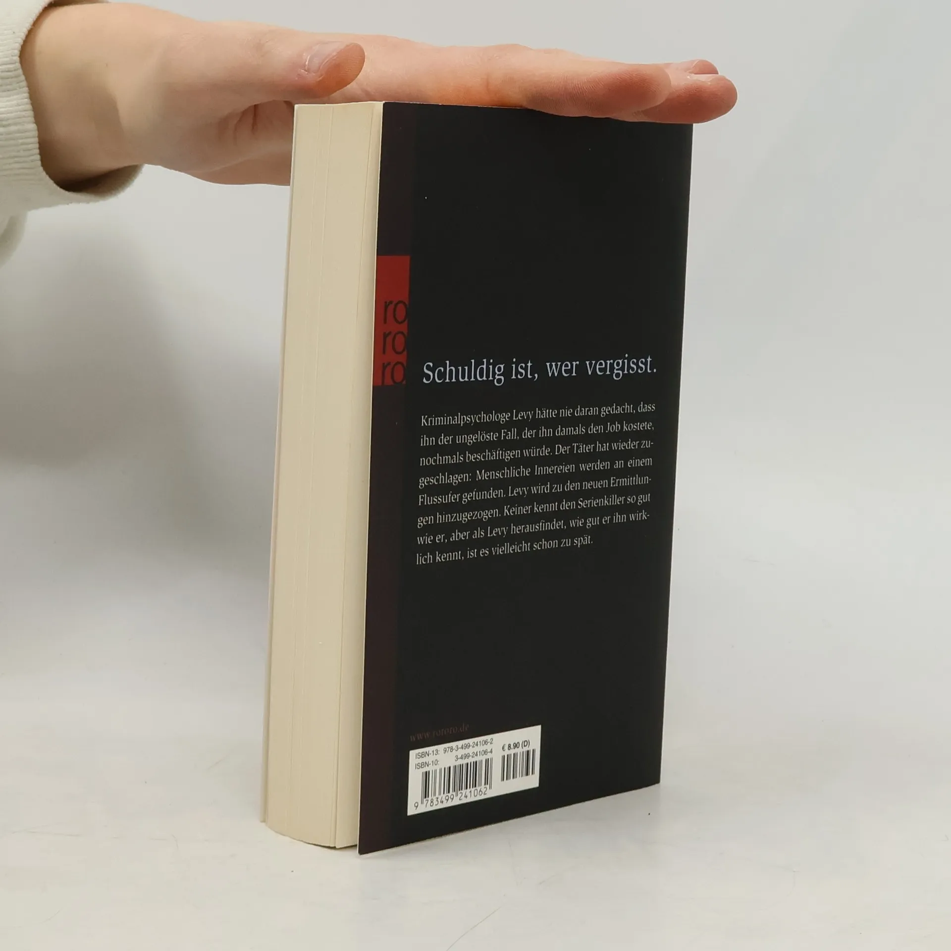 Schuldig ist, wer vergisst Kriminalpsychologe Levy hätte nie daran gedacht, dass ihn der ungelöste Fall, der ihm damals den Job kostete, nochmals beschäftigen würde. Der Täter hat wieder zugeschlagen: Menschliche Innereien werden an einem Flussufer gefunden. Levy wird zu den neuen Ermittlungen hinzugezogen. Keiner kennt den Serienkiller so gut wie er, aber als Levy herausfindet, wie gut er ihn wirklich kennt, ist es vielleicht schon zu spät.