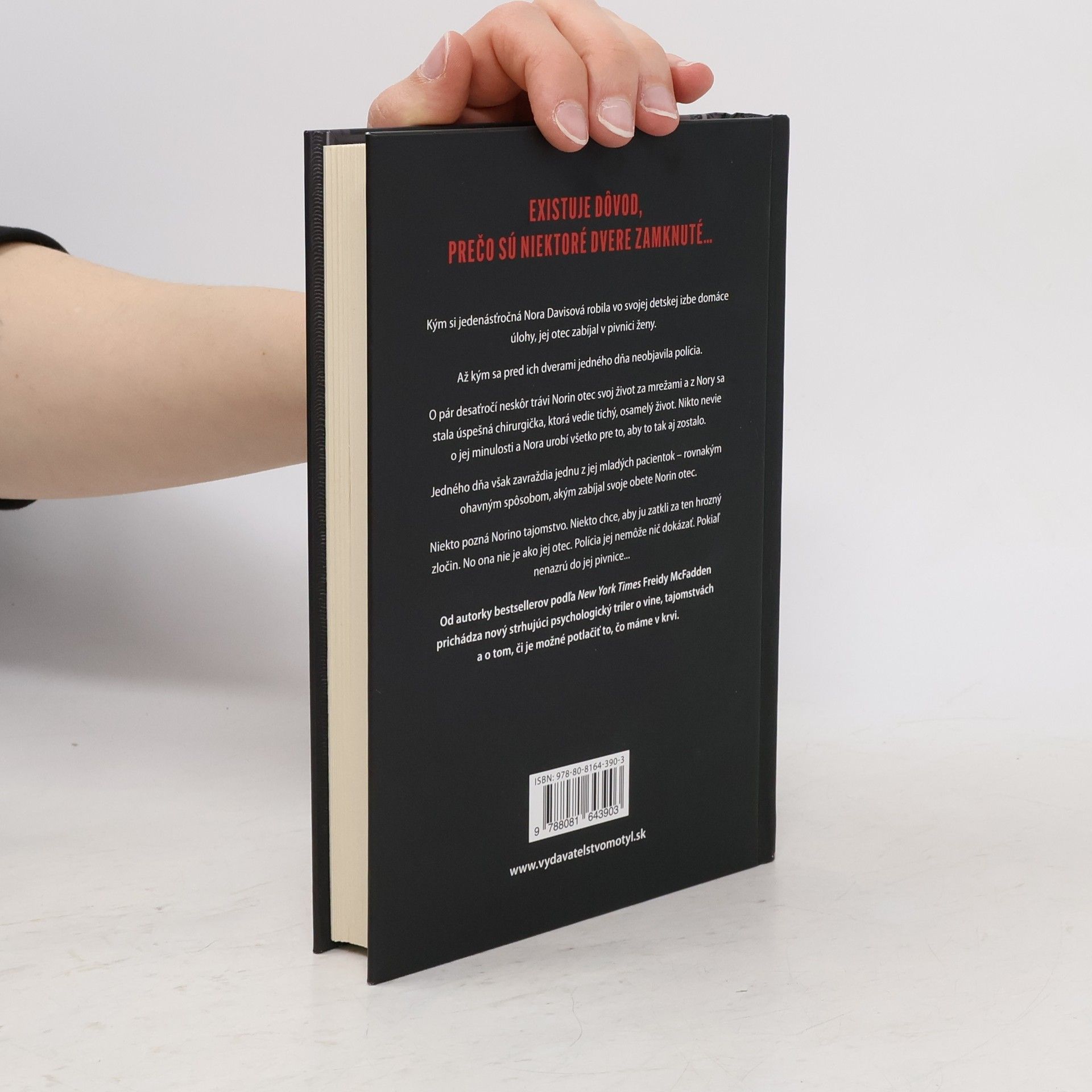 Existuje dôvod, prečo sú niektoré dvere zamknuté... Kým si jedenásťročná Nora Davisová robila vo svojej detskej izbe domáce úlohy, jej otec zabíjal v pivnici ženy. Až kým sa pred ich dverami jedného dňa neobjavila polícia. O pár desaťročí neskôr trávi Norin otec svoj život za mrežami a z Nory sa stala úspešná chirurgička, ktorá vedie tichý, osamelý život. Nikto nevie o jej minulosti a Nora urobí všetko pre to, aby to tak aj zostalo. Jedného dňa však zavraždia jednu z jej mladých pacientok – rovnakým ohavným spôsobom, akým zabíjal svoje obete Norin otec. Niekto pozná Norino tajomstvo. Niekto chce, aby ju zatkli za ten hrozný zločin. No ona nie je ako jej otec. Polícia jej nemôže nič dokázať. Pokiaľ nenazrú do jej pivnice... Od autorky bestsellerov podľa New York Times Freidy McFadden prichádza nový strhujúci psychologický triler o vine, tajomstvách a o tom, či je možné potlačiť to, čo máme v krvi.