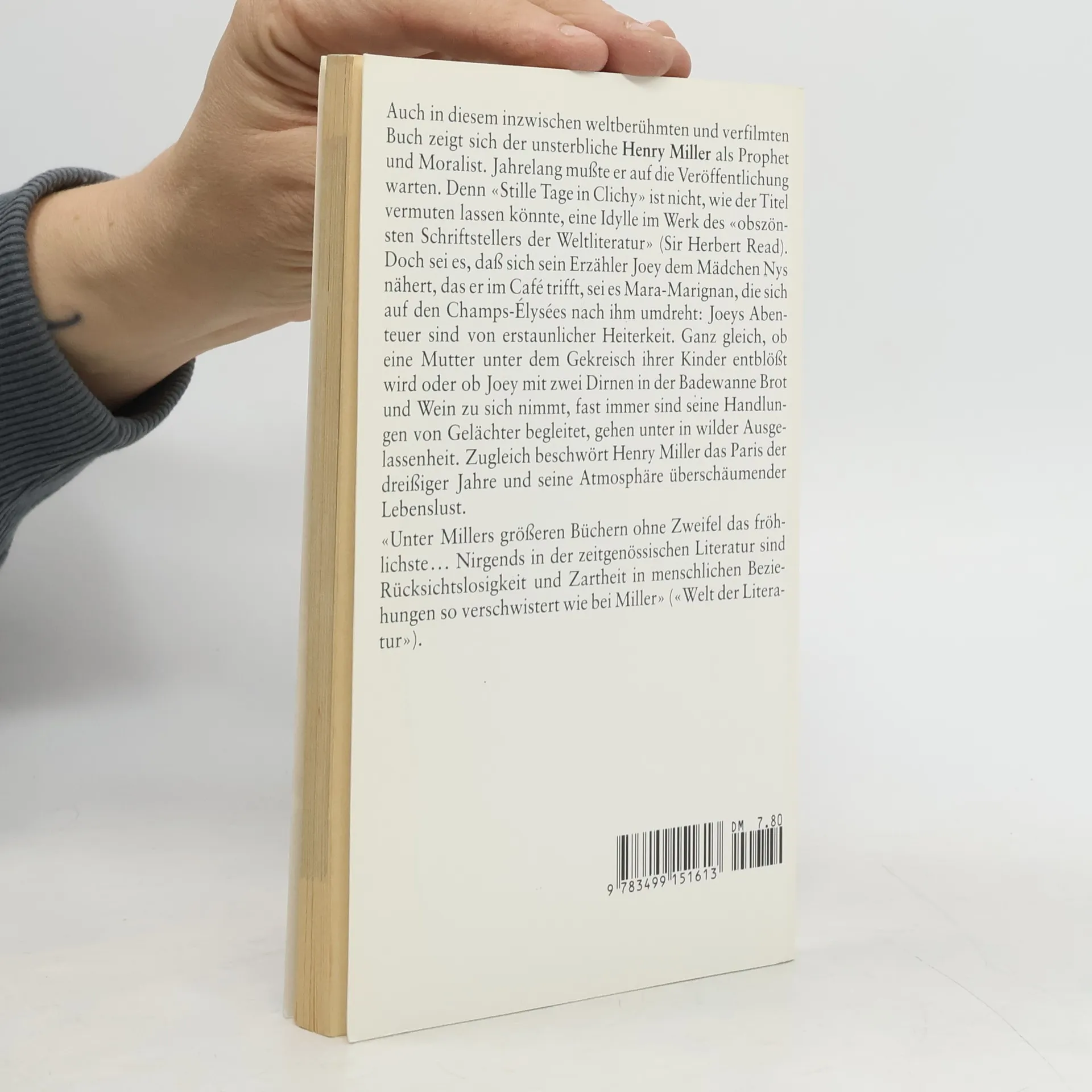 Auch in diesem inzwischen weltberühmten und verfilmten Buch zeigt sich der unsterbliche Henry Miller als Prophet und Moralist. Jahrelang musste er auf die Veröffentlichung warten. Denn «Stille Tage in Clichy» ist nicht, wie der Titel vermuten lassen könnte, eine Idylle im Werk des „obszönsten Schriftstellers der Weltliteratur“ (Sir Herbert Read). Doch sei es, dass sich sein Erzähler Joey dem Mädchen Nys nähert, das er im Café trifft, sei es Mara-Marignan, die sich auf dem Champs-Élysées nach ihm umdreht: Joeys Abenteuer sind von erstaunlicher Heiterkeit. Ganz gleich, ob eine Mutter unter dem Gekreisch ihrer Kinder entblößt wird oder ob Joey mit zwei Dirnen in der Badewanne Brot und Wein zu sich nimmt, fast immer sind seine Handlungen von Gelächter begleitet, gehen unter in wilder Ausgelassenheit. Zugleich beschwört Henry Miller das Paris der dreißiger Jahre und seiner Atmosphäre überschäumender Lebenslust.