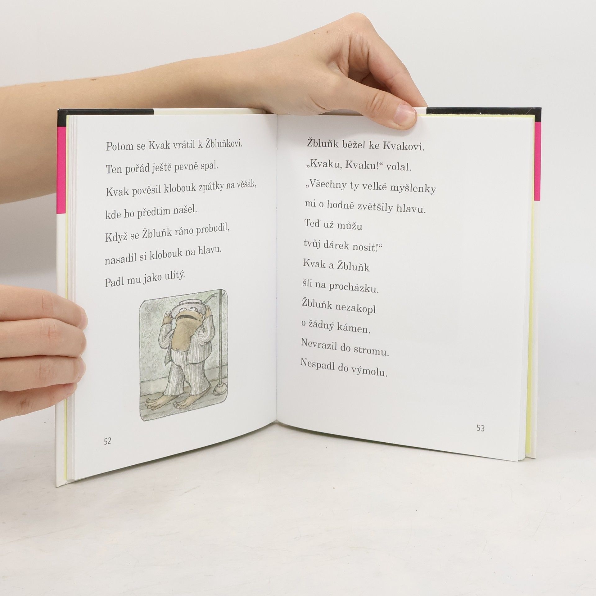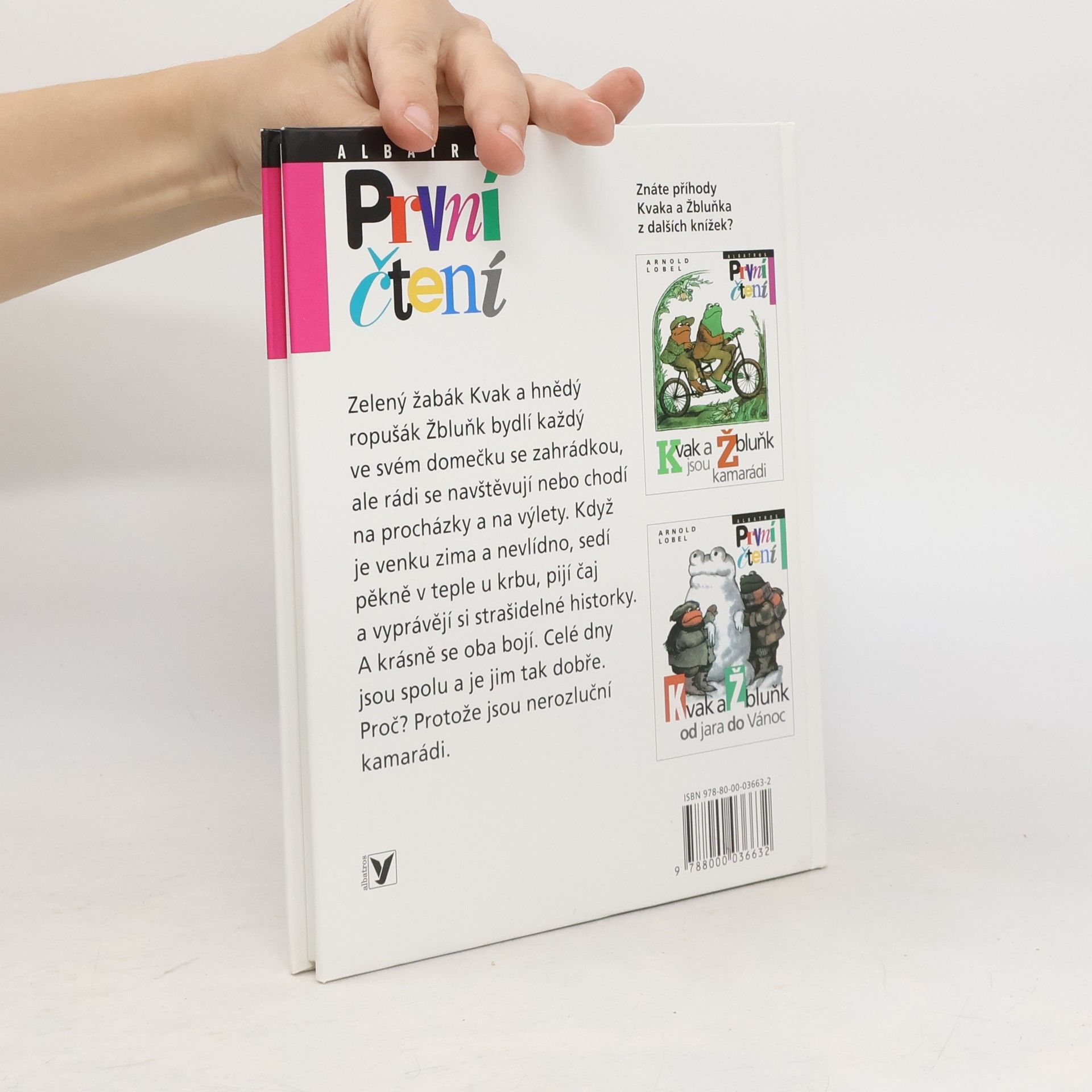 Zelený žabák Kvak a hnědý ropušák Žbluňk bydlí každý ve svém domečku se zahrádkou, ale rádi se navštěvují nebo chodí na procházky a na výlety. Když je venku zima a nevlídno, sedí pěkně v teple u krbu, pijí čaj a vyprávějí si strašidelné historky. A krásně se oba bojí. Celé dny jsou spolu a je jim tak moc dobře. Proč? Protože jsou nerozluční kamarádi. Ten, kdo už je zná z knížek Kvak a Žbluňk jsou kamarádi či Kvak a Žbluňk od jara do Vánoc, je jistě rád znovu potká, a ten, kdo o nich ještě neslyšel, má právě teď příležitost se s nimi seznámit. A protože má knížka velká písmena, snadno ji přelouská každý začínající čtenář. S Kvakem a Žbluňkem se písmenek nikdo bát nemusí!