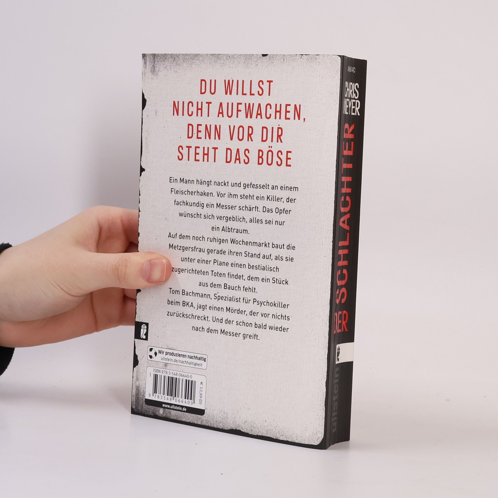 Du willst nicht aufwachen, denn vor dir steht das Böse Ein Mann hängt nackt und gefesselt an einem Fleischerhaken. Vor ihm steht ein Killer, der fachkundig ein Messer schärft. Das Opfer wünscht sich vergeblich, alles sei nur ein Albtraum. Auf dem noch ruhigen Wochenmarkt baut die Metzgersfrau gerade ihren Stand auf, als sie unter einer Plane einen bestialisch zugerichteten Toten findet, dem ein Stück aus dem Bauch fehlt. Tom Bachmann, Spezialist beim BKA für gestörte Psychokiller, jagt einen Mörder, der vor nichts zurückschreckt. Und der schon bald wieder nach dem Messer greift.