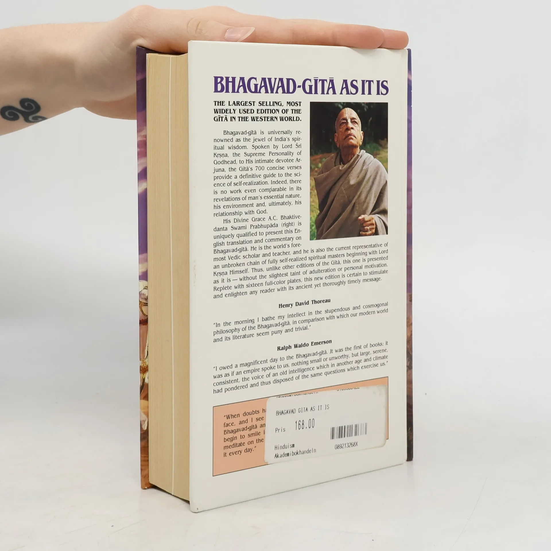 The Bhagavad-gita is the main source-book on yoga and a concise summary of India's Vedic wisdom. Yet remarkably, the setting for this best-known classic of spiritual literature is an ancient Indian battlefield. At the last moment before entering battle, the great warrior Arjuna begins to wonder about the real meaning of his life. Why should he fight against his friends and relatives? Why does he exist? Where is he going after death? In the Bhagavad-gita, Lord Krsna, Arjuna's friend and spiritual master, brings His disciple from perplexity to spiritual enlightenment. In the course of doing so, Krsna concisely but definitively explains transcendental knowledge; karma-yoga, jñana-yoga, dhyana-yoga, and bhakti-yoga; knowledge of the Absolute; devotional service; the three modes of material nature; the divine and demoniac natures; and much more. Bhagavad-gita As It Is is the largest-selling, most widely used edition of the Gita in the world.