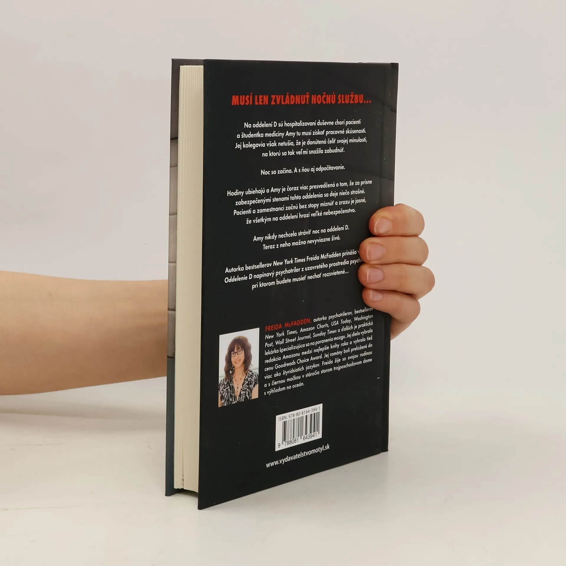 Jediné, čo potrebuje, je len zvládnuť nočnú službu… Na oddelení D sú hospitalizovaní duševne chorí pacienti a študentka medicíny Amy tu musí získať pracovné skúsenosti. Jej kolegovia však netušia, že je donútená čeliť svojej minulosti, na ktorú sa tak veľmi snažila zabudnúť. Noc sa začína. A s ňou aj odpočítavanie. Hodiny ubiehajú a Amy je čoraz viac presvedčená o tom, že za prísne zabezpečenými stenami tohto oddelenia sa deje niečo strašné. Pacienti a zamestnanci začnú bez stopy miznúť a zrazu je jasné, že všetkým na oddelení hrozí veľké nebezpečenstvo. Amy nikdy nechcela stráviť noc na oddelení D. Teraz z neho možno nevyviazne živá. Autorka bestsellerov New York Times Freida McFadden prináša v knihe Oddelenie D napínavý triler z uzavretého prostredia psychiatrickej liečebne, pri ktorom budete musieť nechať rozsvietené…