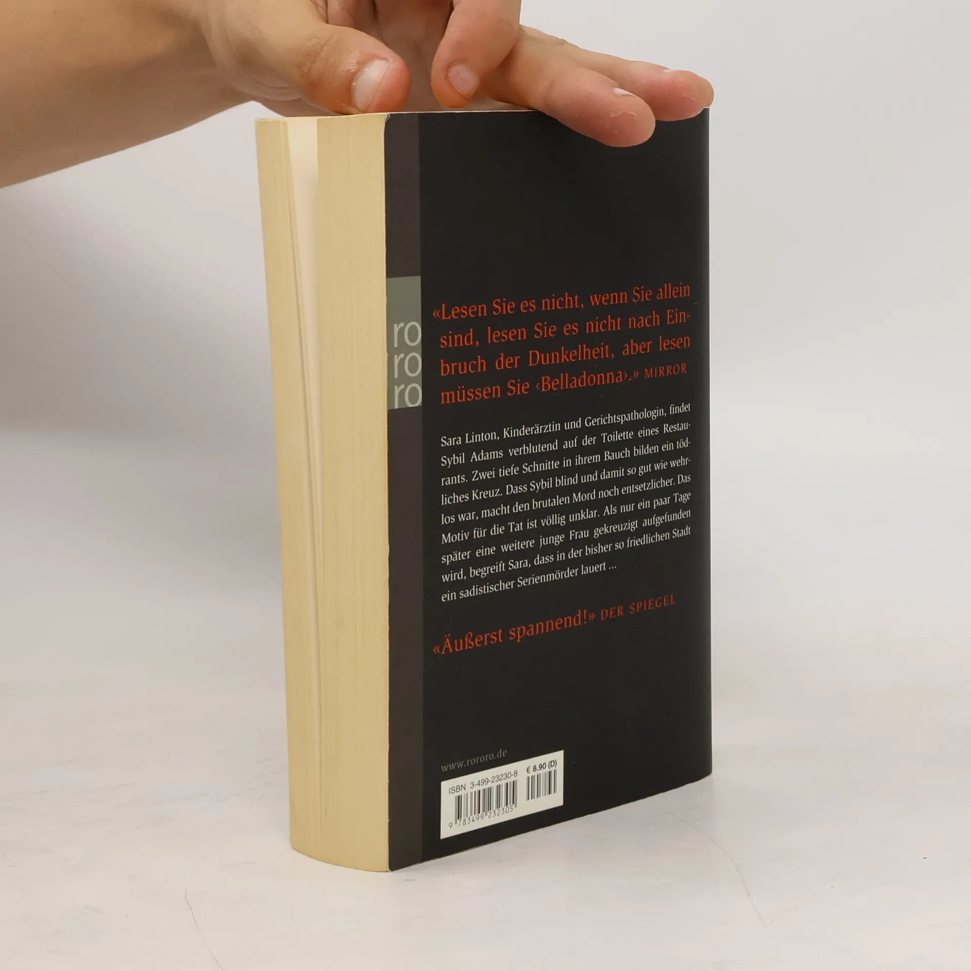 «Lesen Sie es nicht, wenn Sie allein sind, lesen Sie es nicht nach Einbruch der Dunkelheit, aber lesen müssen Sie ‹Belladonna›.» (Mirror)Sara Linton, Kinderärztin und Gerichtspathologin, findet Sybil Adams verblutend auf der Toilette eines Restaurants. Zwei tiefe Schnitte in ihrem Bauch bilden ein tödliches Kreuz. Dass Sybil blind und damit so gut wie wehrlos war, macht den brutalen Mord noch entsetzlicher. Das Motiv für die Tat ist völlig unklar. Als nur ein paar Tage später eine weitere junge Frau gekreuzigt aufgefunden wird, begreift Sara, dass in der bisher so friedlichen Stadt ein sadistischer Serienmörder lauert...«Äußerst spannend!» DER SPIEGEL