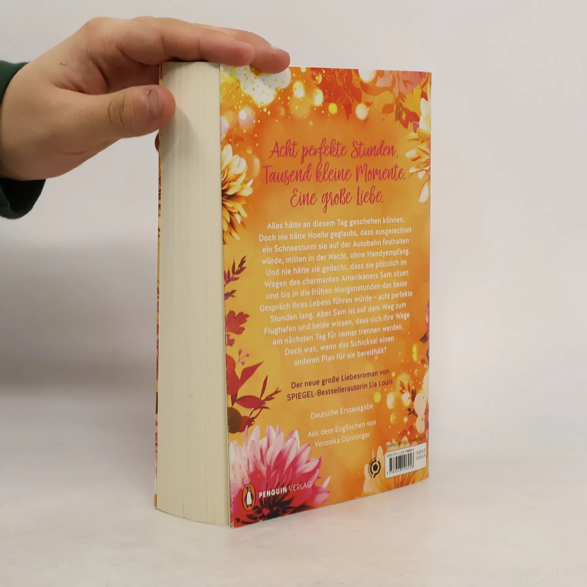 Acht perfekte Stunden. Tausend kleine Momente. Eine große Liebe. Alles hätte an diesem Tag geschehen können. Doch nie hätte Noelle geglaubt, dass ausgerechnet an diesem Tag ein Schneesturm sie auf der Autobahn festhalten würde – mitten in der Nacht, ohne Handyempfang. Und nie hätte sie gedacht, dass sie plötzlich im Wagen des charmanten Amerikaners Sam sitzen und bis in die frühen Morgenstunden das beste Gespräch ihres Lebens führen würde – acht perfekte Stunden lang. Aber Sam ist auf dem Weg zum Flughafen und beide wissen, dass sich ihre Wege am nächsten Tag für immer trennen werden. Doch was, wenn das Schicksal einen anderen Plan für sie bereithält? Der romantische zweite Roman der SPIEGEL-Bestsellerautorin in Sonderausstattung: Funkelndes Perlmuttpapier lässt das Buch in goldenem Glanz erstrahlen Gleich weiterlesen: >>> Entdecken Sie auch Lia Louis' romantischen Bestseller »Jedes Jahr im Juni«. >>> Und in Kürze erhältlich, der große neue Roman der Bestsellerautorin: »Unser Lied für immer«.