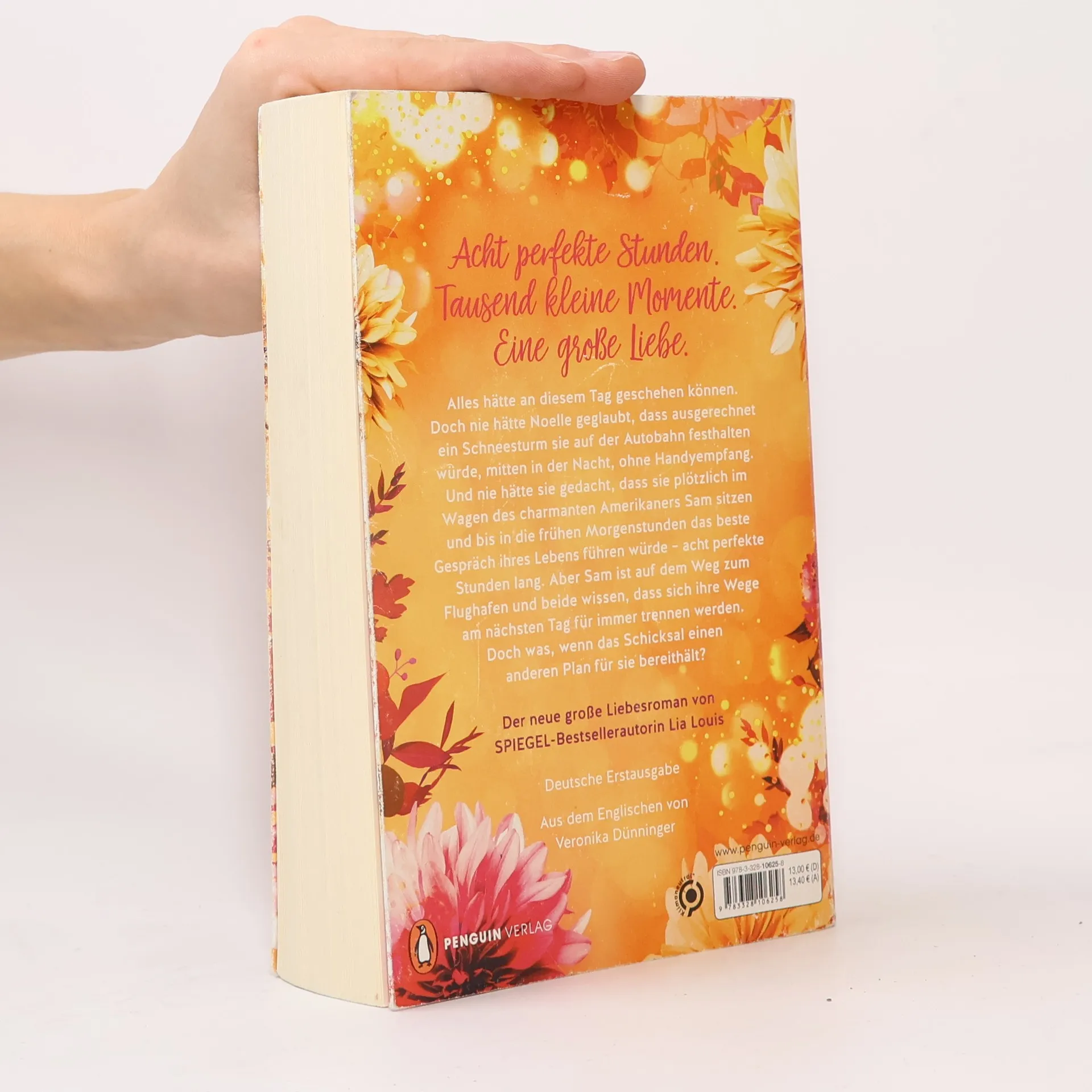 Acht perfekte Stunden. Tausend kleine Momente. Eine große Liebe. Alles hätte an diesem Tag geschehen können. Doch nie hätte Noelle geglaubt, dass ausgerechnet an diesem Tag ein Schneesturm sie auf der Autobahn festhalten würde – mitten in der Nacht, ohne Handyempfang. Und nie hätte sie gedacht, dass sie plötzlich im Wagen des charmanten Amerikaners Sam sitzen und bis in die frühen Morgenstunden das beste Gespräch ihres Lebens führen würde – acht perfekte Stunden lang. Aber Sam ist auf dem Weg zum Flughafen und beide wissen, dass sich ihre Wege am nächsten Tag für immer trennen werden. Doch was, wenn das Schicksal einen anderen Plan für sie bereithält? Der romantische zweite Roman der SPIEGEL-Bestsellerautorin in Sonderausstattung: Funkelndes Perlmuttpapier lässt das Buch in goldenem Glanz erstrahlen Gleich weiterlesen: >>> Entdecken Sie auch Lia Louis' romantischen Bestseller »Jedes Jahr im Juni«. >>> Und in Kürze erhältlich, der große neue Roman der Bestsellerautorin: »Unser Lied für immer«.