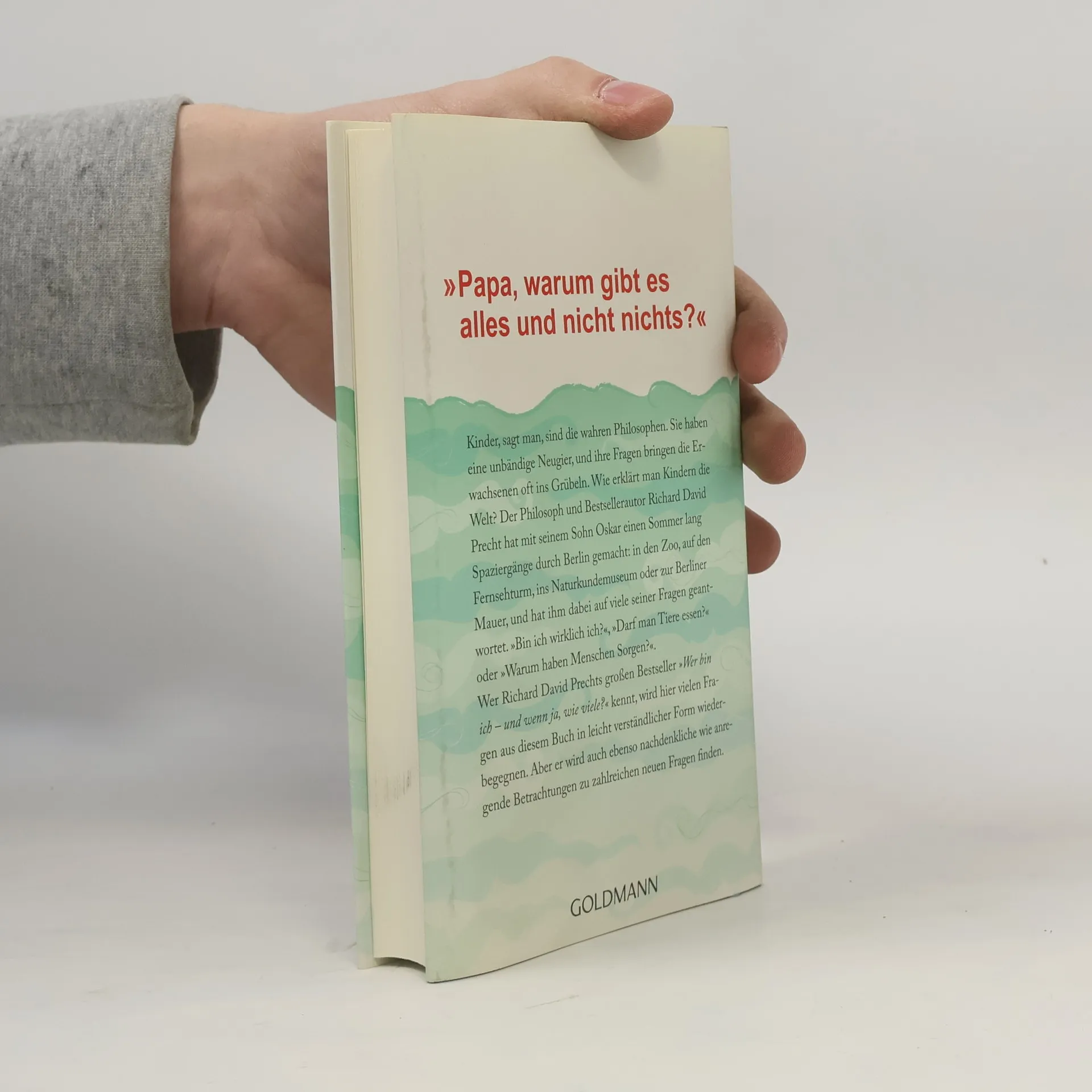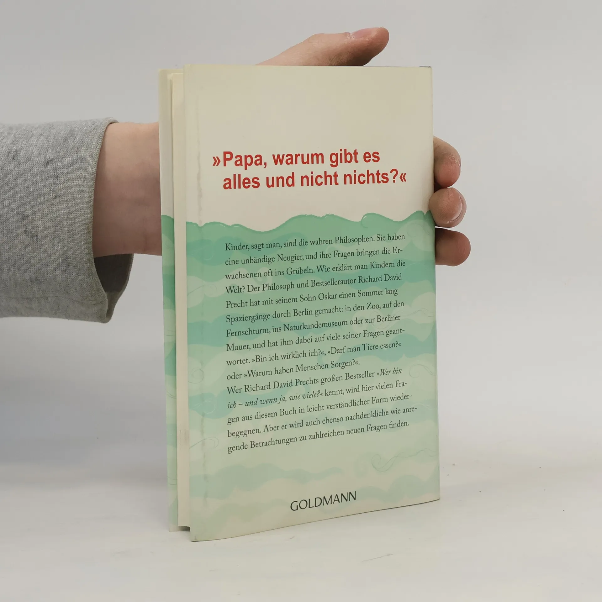 Richard David Precht erklärt seinem Sohn Oskar die Welt Kinder, sagt man, sind die wahren Philosophen. Sie haben eine unbändige Neugier, und ihre Fragen bringen die Erwachsenen oft ins Grübeln. Wie erklärt man Kindern die Welt? Der Philosoph und Bestsellerautor Richard David Precht hat mit seinem Sohn Oskar einen Sommer lang Spaziergänge durch Berlin gemacht: in den Zoo, auf den Fernsehturm, ins Naturkundemuseum oder zur Synagoge, und hat ihm dabei auf viele seiner Fragen geantwortet. „Bin ich wirklich ich?“, „Darf man Tiere essen?“ oder „Warum haben Menschen Sorgen?“. Auf spielerische Art und Weise und mit vielen Geschichten zeigt Precht den Kindern unsere Welt und hilft ihnen, sie besser zu verstehen. Nach „Wer bin ich und wenn ja, wie viele?“ nun das Buch zur Philosophie für alle jungen Menschen, die es genauer wissen wollen!