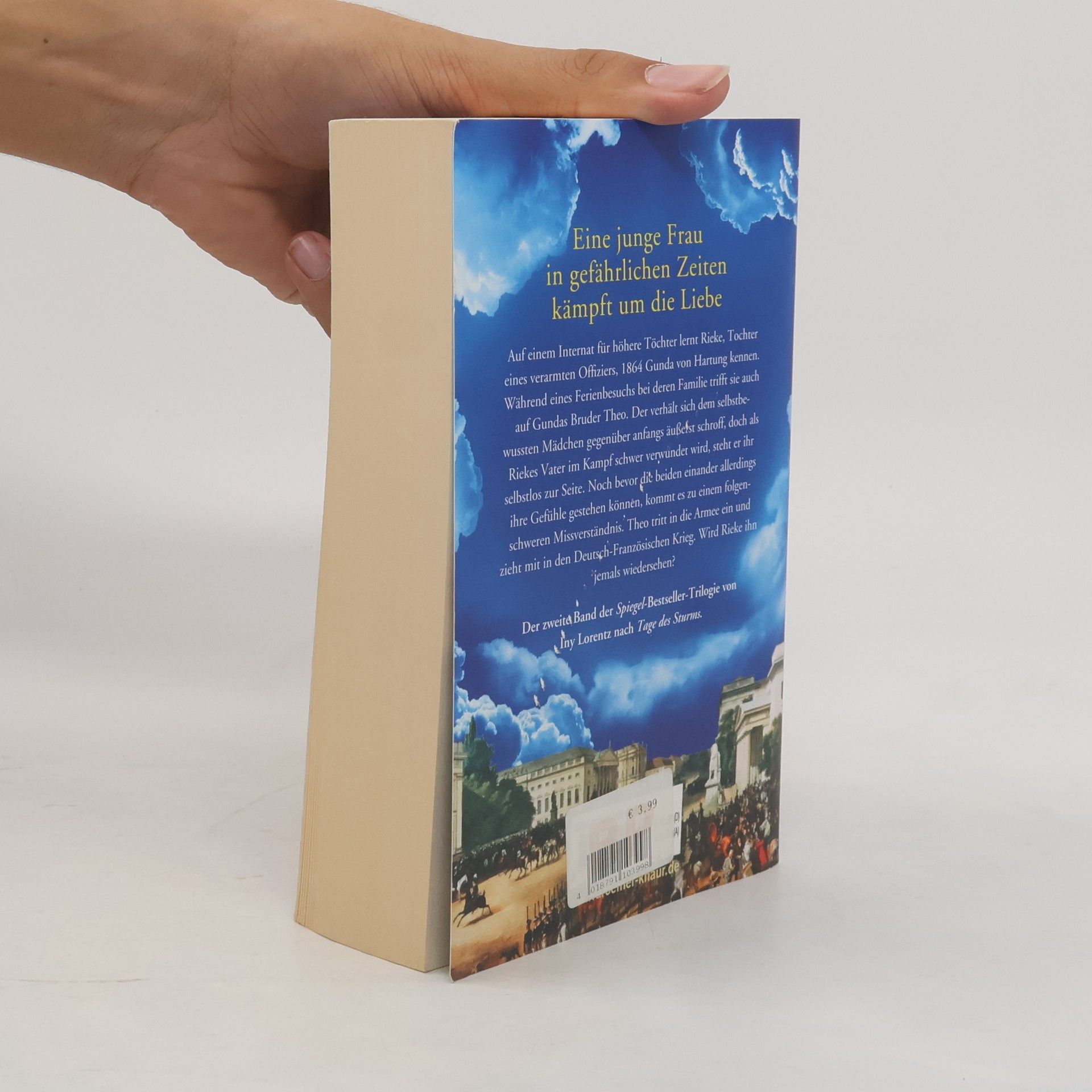 Band zwei der Spiegel-Bestseller-Trilogie von Iny Lorentz nach „Tage des Sturms“. Der neue Teil der Berlin-Trilogie „Licht in den Wolken“ handelt von einer tragischen Liebesgeschichte – situiert im 19. Jahrhundert zur prekären Zeit des Deutsch-Französischen Krieges. Auch hier kommen begeisterte Leser der erfolgreichen Berlin-Trilogie der Bestseller-Autorin wieder einmal voll auf ihre Kosten:Auf einem Internat für höhere Töchter lernt Rieke, Tochter eines verarmten Offiziers, 1864 Gunda von Hartung kennen. Während eines Ferienbesuchs bei deren Familie trifft sie auch auf Gundas Bruder Theo. Der verhält sich dem selbstbewussten Mädchen gegenüber anfangs äußerst schroff, doch als Riekes Vater im Kampf schwer verwundet wird, steht er ihr selbstlos zur Seite. Noch bevor die beiden einander allerdings ihre Gefühle gestehen können, kommt es zu einem folgenschweren Missverständnis. Theo tritt in die Armee ein und zieht mit in den Deutsch-Französischen Krieg. Wie geht die Liebesgeschichte aus? Wird Rieke ihn jemals wiedersehen? „Starke Story, lebendige Figuren, historische Details, nicht überfrachtet, sondern genau richtig gesetzt“ – auf denglers-buchkritik zu „Tage des Sturms“, dem ersten Teil der Berlin-Trilogie von Spiegel-Bestseller-Autorin Iny Lorentz.