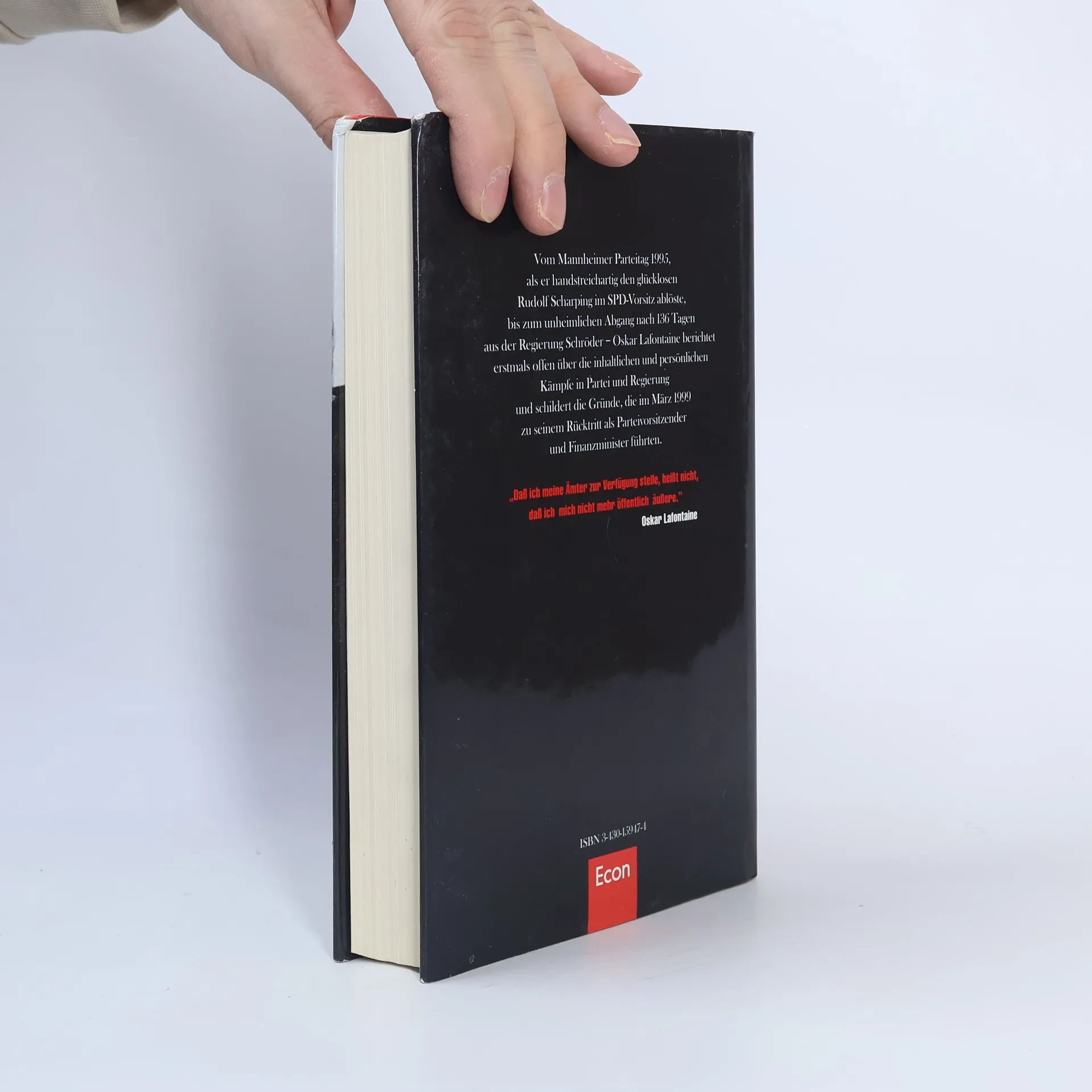 Vom Mannheimer Parteitag 1995, als er handstreichartig den glücklosen Rudolf Scharping im SPD-Vorsitz ablöste, bis zum unheimlichen Abgang nach 136 Tagen aus der Regierung Schröder - Oskar Lafontaine berichtet erstmals offen über die inhaltlichen und persönlichen Kämpfe in Partei und Regierung und schildert die Gründe, die im März 1999 zu seinem Rücktritt als Parteivorsitzender und Finanzminister führten.