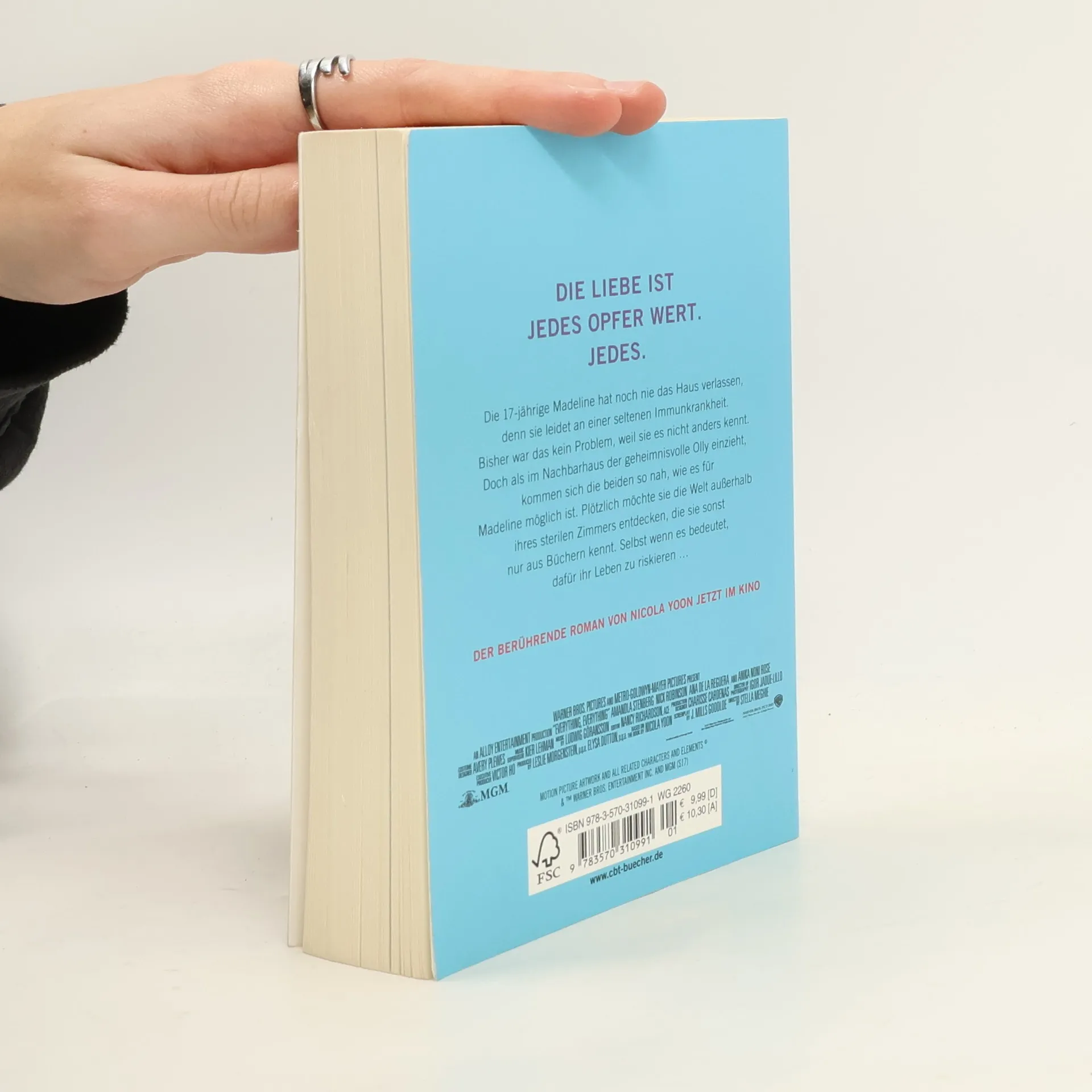 »Am Anfang war nichts. Und dann war alles.« Die 17-jährige Madeline hat noch nie das Haus verlassen, denn sie leidet an einer seltenen Immunkrankheit. Bisher war das kein Problem, weil sie es nicht anders kennt. Doch als im Nachbarhaus der geheimnisvolle Olly einzieht, kommen sich die beiden so nah, wie es für Madeline möglich ist. Plötzlich möchte sie die Welt außerhalb ihres sterilen Zimmers entdecken, die sie sonst nur aus Büchern kennt. Selbst wenn es bedeutet, dafür ihr Leben zu riskieren…