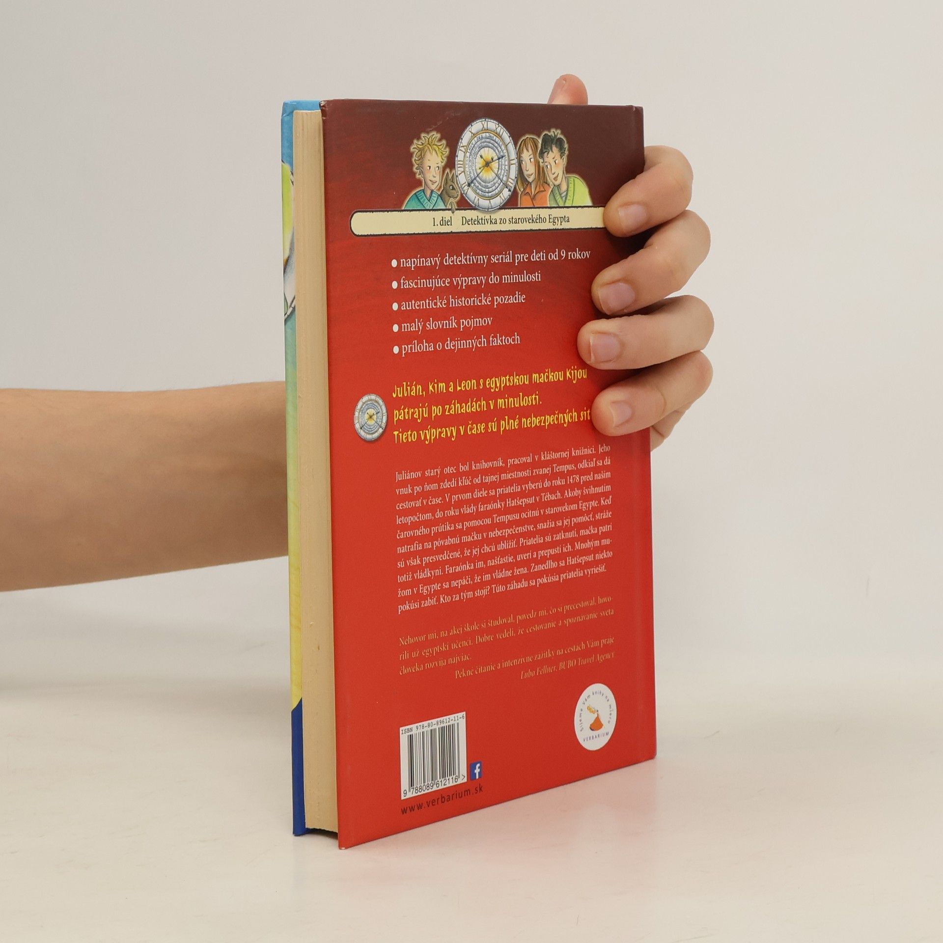 Juliánov starý otec bol knihovník, pracoval v kláštornej knižnici. Jeho vnuk po ňom zdedí kľúč od tajnej miestnosti zvanej Tempus, odkiaľ sa dá cestovať v čase. V prvom diele sa priatelia vyberú do roku 1478 pred naším letopočtom, do roku vlády faraónky Hatšepsut v Tébach. Akoby švihnutím čarovného prútika sa pomocou Tempusu ocitnú v starovekom Egypte. Keď natrafia na pôvabnú mačku v nebezpečenstve, snažia sa jej pomôcť, stráže sú však presvedčené, že jej chcú ublížiť. Priatelia sú zatknutí, mačka patrí totiž vládkyni. Faraónka im, našťastie, uverí a prepustí ich. Mnohým mužom v Egypte sa nepáči, že im vládne žena. Zanedlho sa Hatšepsut niekto pokúsi zabiť. Kto za tým stojí? Túto záhadu sa pokúsia priatelia vyriešiť.