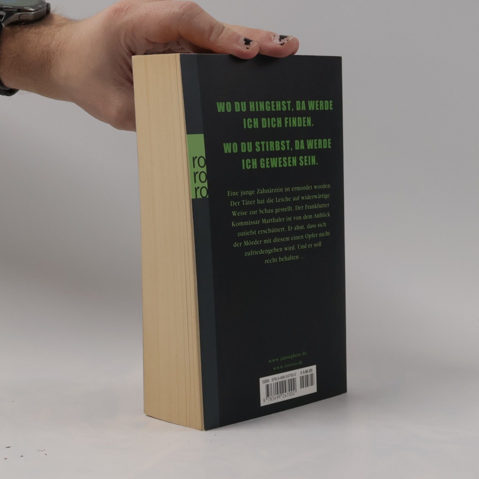 Wo du hingehst, da werde ich dich finden. Wo du stirbst, da werde ich gewesen sein.Eine junge Zahnärztin ist ermordet worden. Der Täter hat die Leiche auf widerwärtige Weise zur Schau gestellt. Der Frankfurter Kommissar Marthaler ist von dem Anblick zutiefst erschüttert. Er ahnt, dass sich der Mörder mit diesem einen Opfer nicht zufrieden geben wird. Und er soll Recht behalten …www. janseghers. de