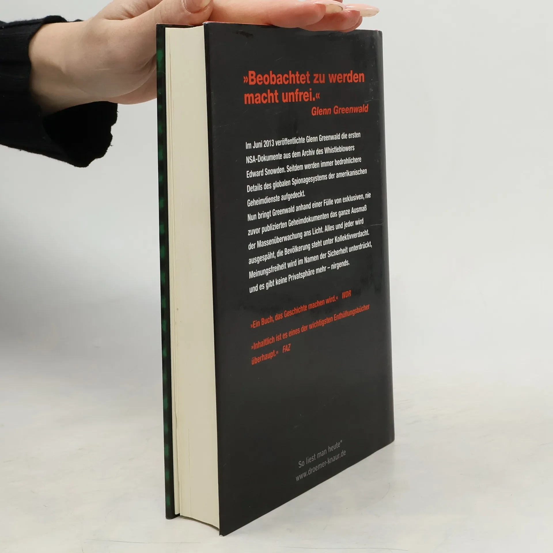 Der 6. Juni 2013 markiert nichts weniger als eine Zeitenwende – den Übergang vom freien Internet zum totalitären. Im Guardian deckte der Jurist und Journalist Glenn Greenwald auf, was der Ex-Geheimdienstmitarbeiter Edward Snowden ihm anvertraut hat. Die amerikanische Sicherheitsbehörde NSA überwacht und speichert weltweit jede Form der digitalen Kommunikation. Die Daten-Server von Google, Yahoo, Microsoft und Facebook werden gegen Bezahlung systematisch abgesaugt. Alle Verschlüsselungstechniken können umgangen werden. Der globale Finanztransfer ist voll einsehbar. Und: Snowdens Dokumente belegen auch, dass die deutsche Regierung hierüber informiert war. Detailliert analysiert Greenwald die Hintergründe des NSA-Skandals und die Folgen für uns alle. Die totale Überwachung ist längst Realität. Es gibt keine Privatsphäre mehr. Die Grundrechte werden im Namen der Sicherheit eingeschränkt. Dieses Buch ist der spektakuläre Höhe- und Schlusspunkt der Snowden-Enthüllungen.