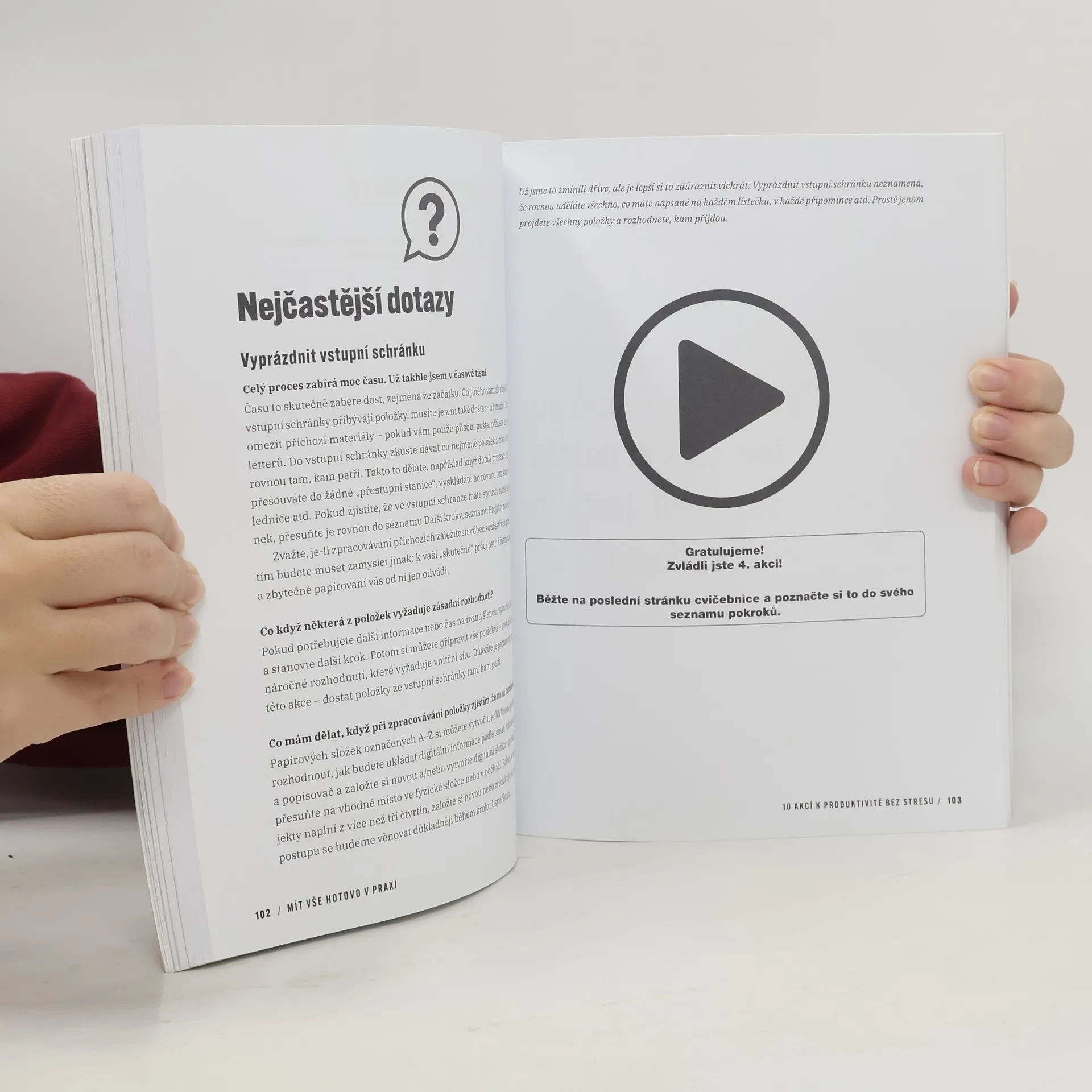 Koho někdy nepřepadl vyčerpávající pocit, že už neví, jak dál? Práce, rodina, domácnost, nevyřízené emaily, nepořádek na stole, prošvihnuté termíny, zapomenuté nápady, únava, stres – přinejmenším občas padne do černé díry chaosu každý z nás. Naštěstí má David Allen řešení. Ověřené roky a oblíbené po celém světě. V této cvičebnici, vhodné pro začátečníky a i pokročilé, jde rovnou k věci. Nejenže rychle pochopíte celý pětikrokový systém produktivity, ale rovnou jej do svého života zavedete. Možná si budete muset koupit pár nových šanonů a složek, ale pod Davidovým vedením to uděláte rádi. Také se naučíte v klidu a s rozvahou třídit své e-maily, úkoly i dlouhodobé projekty a v neposlední řadě bez výčitek odložit to, čemu se věnovat nechcete. Co bude výsledkem? Čistá hlava, ve které bude konečně opět prostor pro vaše jedinečné nápady. A až vás napadnou, hned budete vědět, kam je uložit a jaký bude další krok k jejich realizaci.