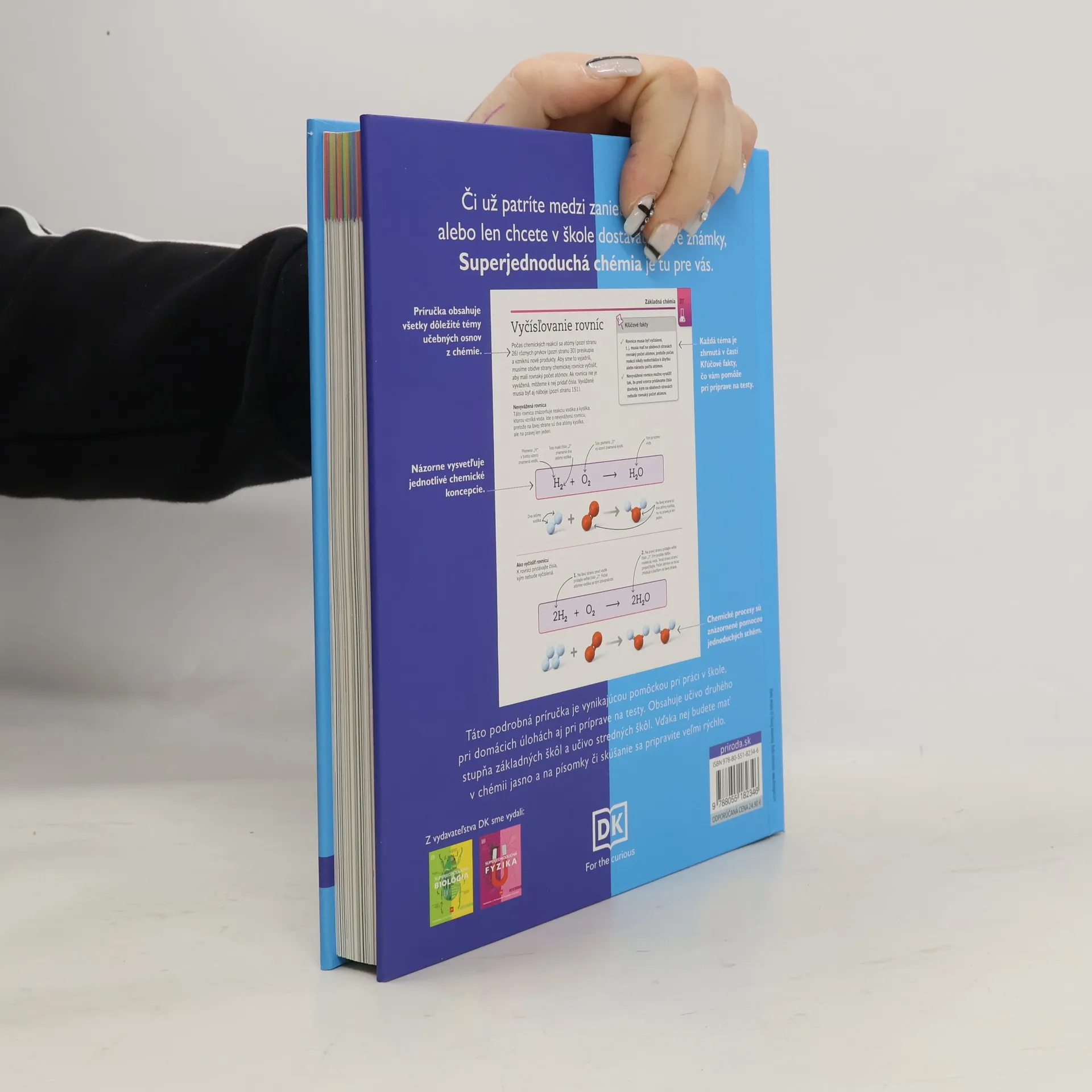 Superjednoduchá CHÉMIA ponúka ucelený prehľad všetkých dôležitých tém, ktoré sú zahrnuté v učebných osnovách chémie pre druhý stupeň základných škôl, pre stredné školy a gymnáziá, a pridáva k nim ďalšie súvislosti a širší pohľad.Táto podrobná, bohato ilustrovaná publikácia vás rýchlo presvedčí o tom, že chémia je zrozumiteľná a fascinujúca! Kniha je rozdelená do 15 väčších kapitol, pričom jednotlivé témy sú vždy zhrnuté v časti Kľúčové fakty, čo je veľmi užitočné pre opakovanie. Chemické deje sú znázornené atraktívnymi ilustráciami, ľahko pochopiteľnými schémami, a veľmi prehľadne sú tu vysvetlené aj jednotlivé vedecké koncepcie. Toto všetko robí z knižky vynikajúcu pomôcku pri práci v škole, pri riešení domácich úloh, aj pri príprave na testy.Takže ak sa snažíte zodpovedne pripraviť na štúdium či budúce povolanie, alebo vás chémia jednoducho zaujíma, táto publikácia je presne to, čo potrebujete.