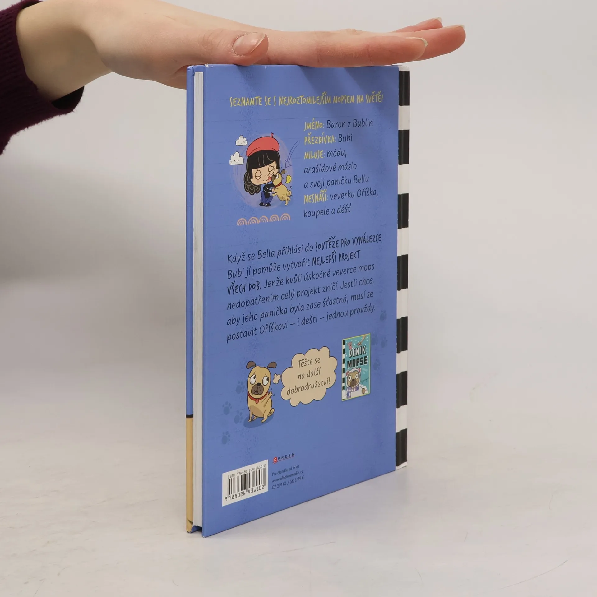 SEZNAMTE SE S NEJROZTOMILEJŠÍM MOPSEM NA SVĚTĚ! JMÉNO: Baron z Bublin PŘEZDÍVKA: Bubi MILUJE: módu, arašídové máslo a svoji paničku Bellu NESNÁŠÍ: veverku Oříška, koupele a déšť Když se Bella přihlásí do SOUTĚŽE PRO VYNÁLEZCE, Bubi jí pomůže vytvořit NEJLEPŠÍ PROJEKT VŠECH DOB. Jenže kvůli úskočné veverce mops nedopatřením celý projekt zničí. Jestli chce, aby jeho panička byla zase šťastná, musí se postavit Oříškovi – i dešti – jednou provždy.