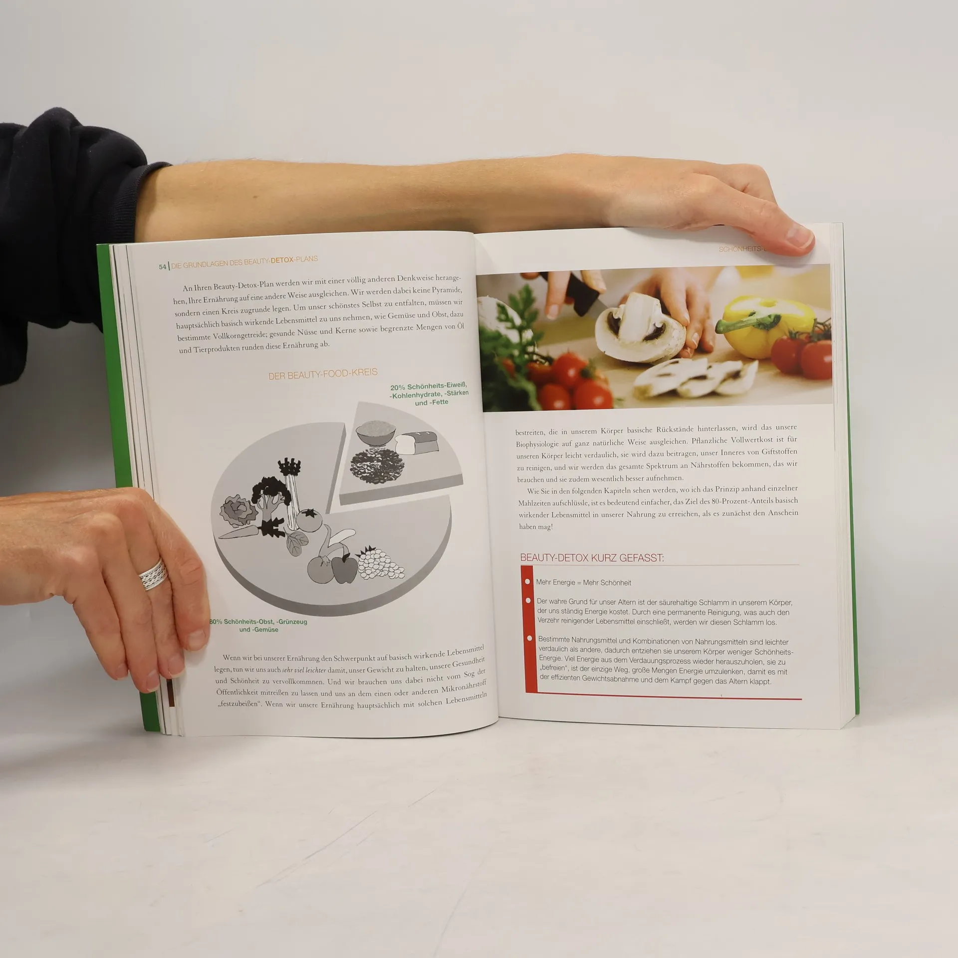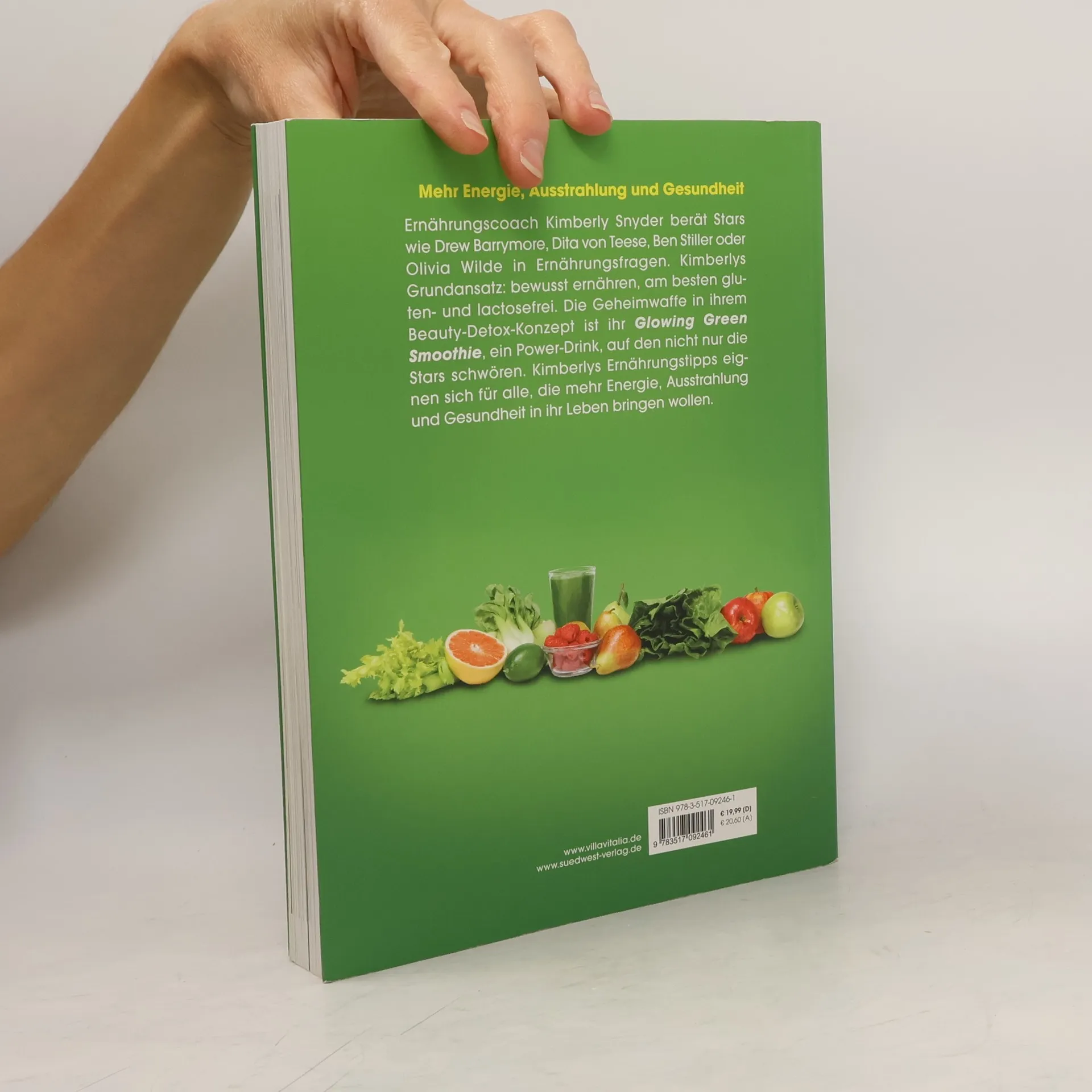 Die Ernährungsberaterin der Stars Ernährungscoach Kimberly Snyder berät Stars wie Drew Barrymore, Dita von Teese oder Olivia Wilde in Ernährungsfragen. Drew Barrymore schwört auf Kimberley Snyder: „I don’t like to diet, I like to eat right and that’s what Kim’s philopsophy is all about. She is brilliant.”Kimberlys Grundansatz: bewusst ernähren, am besten gluten- und lactosefrei. Um konkrete Beauty-Resultate zu sehen, muss die Ernährung allerdings langfristig umgestellt werden. Ihr Fokus liegt auf Bio-Obst und -Gemüse. Als echte Schönmacher empfiehlt sie zum Beispiel Ananas: Die regt die Produktion von Kollagen im Körper an. Gegen Akne-Attacken helfen Zwiebeln, weil sie die Leber beim Entgiften unterstützen. Und Bananen beugen durch ihren Kalium- und Biotin-Gehalt Augenringen vor. Kultstatus hat in den USA ihr „Glowing Green Smoothie“ aus Salat, Spinat und Sellerie, für einen strahlenden Teint.Das Buch besteht aus zwei Teilen: Step 1: Basiswissen zur Beauty-Detox-Strategie und Step 2: Konkrete Ernährungspläne für Kimberlys 3-Phasenmodell: 1. Blühende Schönheit (Startphase), 2. Strahlende Schönheit (Konsolidierung), 3. Wahre Schönheit (höchstes Level) mit detaillierten Ernährungsplänen Ausstattung: ca. 30 Frabfotos und zahlreiche Tabellen