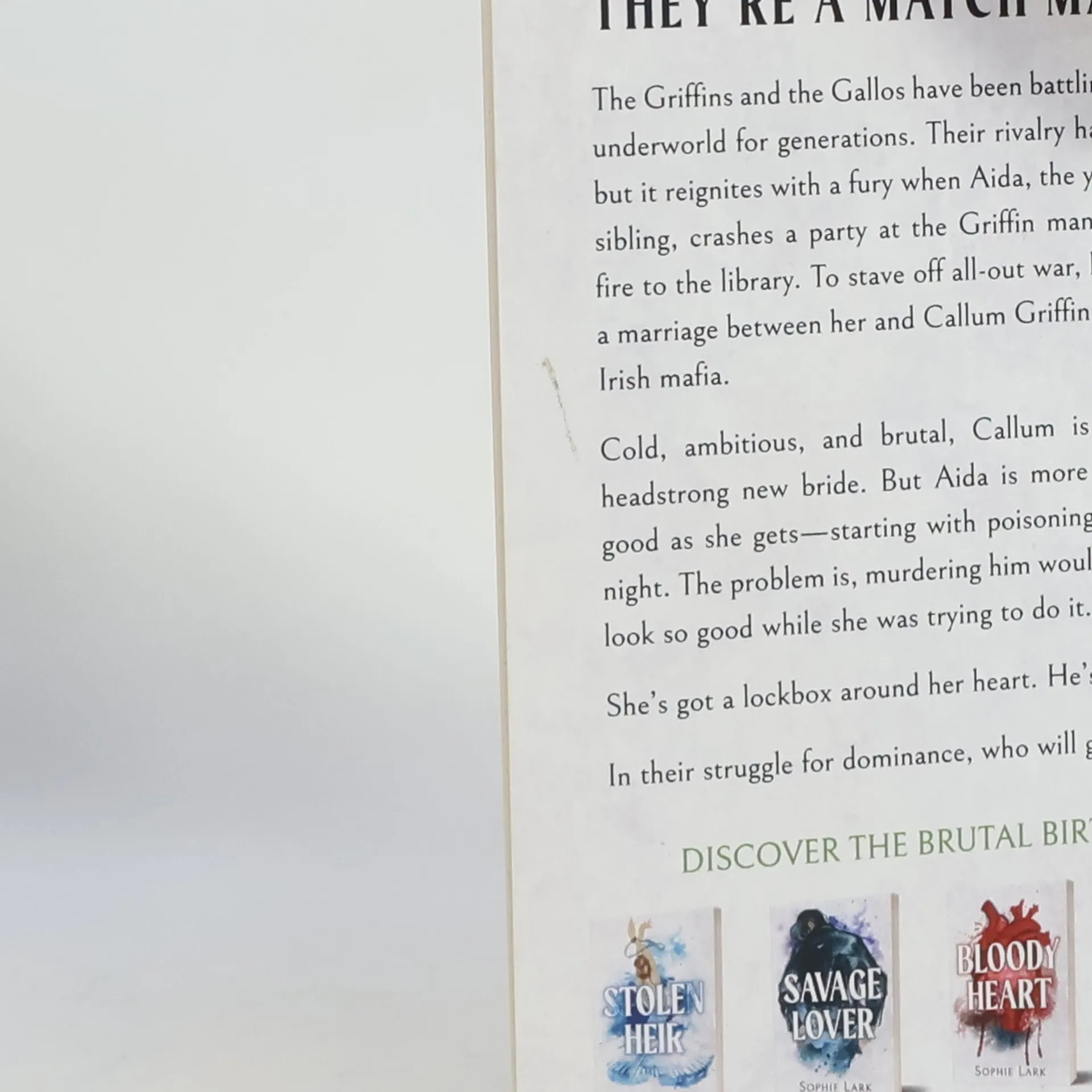 He's no prince charming. Callum Griffin is the heir to the Irish Mafia. He's ruthless, arrogant, and he wants to kill me. We got off on the wrong foot when I set a (very small) fire in his house. Our families believe a marriage pact is the only thing that will prevent all-out warfare. I think I might need to murder him while he sleeps. This would all be a lot easier if Callum wasn't so damned good-looking. But I've got a lockbox around my heart. Because even if I'm forced to marry him. I could never love a brutal prince.