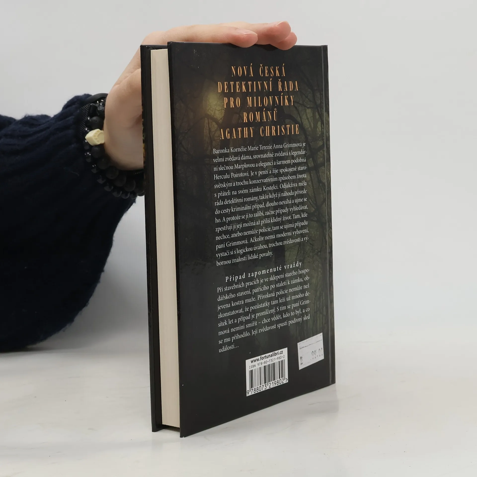 Nová česká detektivní řada pro milovníky románů Agathy Christie. Od autora trilogie o Karlu IV. (doposud vyšel titul Karel IV - Tajný deník a titul Karel IV - Císař a císařovna) Baronka Kornélie Marie Terezie Anna Grimmová je velmi zvědavá dáma, srovnatelně zvědavá s legendární slečnou Marplovou a elegancí a šarmem podobná Herculu Poirotovi. Je v penzi a žije spokojeně starosvětským a trochu konzervativním způsobem s přáteli na svém zámku Kostelci. Odjakživa měla ráda detektivní romány, takže když jí náhoda přivede do cesty kriminální případ, dlouho neváhá a ujme se ho. A protože se jí to zalíbí, začne případy vyhledávat, zpestřují jí její možná až příliš klidný život. Tam, kde nechce, anebo nemůže policie, tam se ujímá případu paní Grimmová. Ačkoliv nemá moderní vybavení, vystačí si s logickou úvahou, trochou zvědavosti a výbornou znalostí lidské povahy. Případ zapomenuté vraždy Při stavebních pracích je ve sklepení starého hospodářského stavení, patřícího po staletí k zámku, objevena kostra muže. Přivolaná policie nemůže než zkonstatovat, že pozůstatky tam leží už mnoho desítek let a případ je promlčený. S tím se paní Grimmová nemíní smířit – chce vědět, kdo to byl, a co se mu přihodilo. Její zvědavost spustí podivný sled událostí…