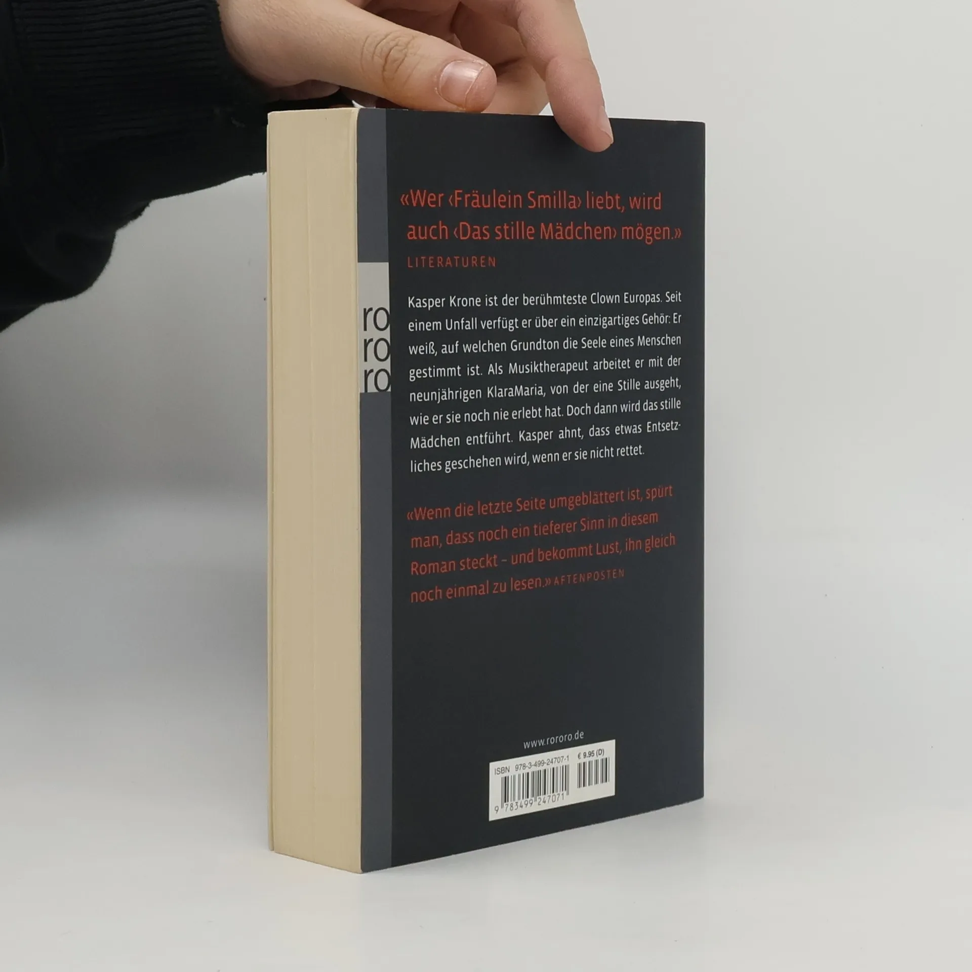 „Wer 'Fräulein Smilla' liebt, wird auch 'Das stille Mädchen' mögen.“ (Literaturen) Kasper Krone ist der berühmteste Clown Europas. Seit einem Unfall verfügt er über ein einzigartiges Gehör: Er weiß, auf welchen Grundton die Seele eines Menschen gestimmt ist. Als Musiktherapeut arbeitet er mit der neunjährigen KlaraMaria, von der eine Stille ausgeht, wie er sie noch nie erlebt hat. Doch dann wird das stille Mädchen entführt. Kasper ahnt, dass etwas Entsetzliches geschehen wird, wenn er sie nicht rettet.„Wenn die letzte Seite umgeblättert ist, spürt man, dass noch ein tieferer Sinn in diesem Roman steckt – und bekommt Lust, ihn gleich noch einmal zu lesen.“ (Aftenposten)