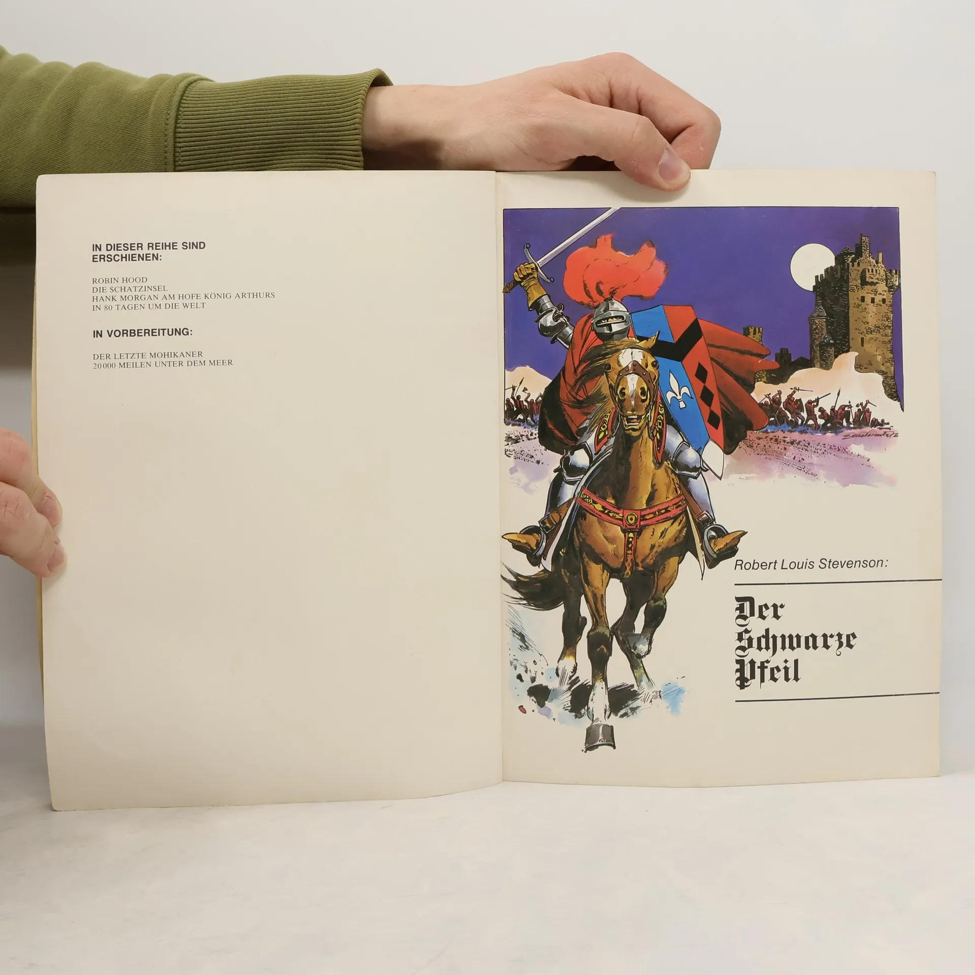 Von Verfolgung, Flucht und Einkerkerung, von Schlachten und Gefechten, berichtet der Roman "Der Schwarze Pfeil", der zur Zeit der Rosenkriege in England (1455 - 1485) spielt. Im Mittelpunkt steht der tapfere junge Richard Shelton und sein Kampf gegen seinen schurkischen Vormund Sir Daniel Brackley. Diese persönliche Fehde wird nicht allein durch das wechselnde Kriegsglück der Häuser York und Lancaster kompliziert, sondern auch durch eine finstere Räuberband, die sich "Der Schwarze Pfeil" nennt. Die "Wrackräuber" schildert in der Tradition der "Schatzinsel" die erbitterte Rivalität dreier Abenteurer, die in der Südsee um den Schatz eines alten Perlenfischers kämpfen. Doch der Alte besitzt übernatürliche Kräfte, und die Schatzsuche wird zu einer echten Herausforderung ..