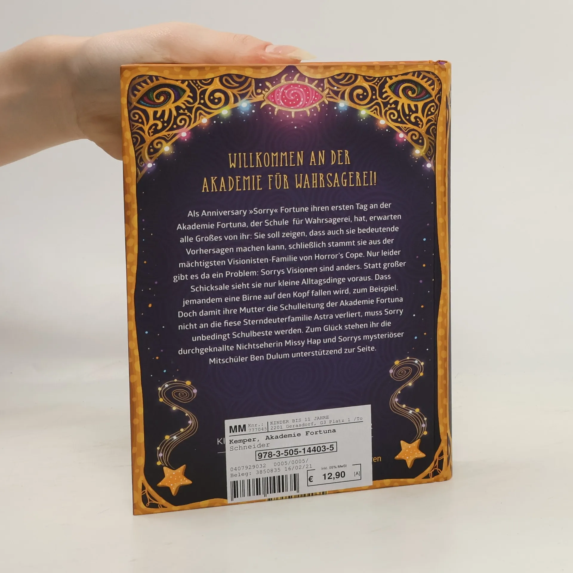 Willkommen an der Akademie für Wahrsagerei! Als Anniversary „Sorry“ Fortune ihren ersten Tag an der Akademie Fortuna, der Schule für Wahrsagerei, hat, wird Großes von ihr erwartet. Sie soll allen zeigen, dass auch sie bedeutende Visionen haben kann, schließlich stammt sie aus der mächtigsten Visionistenfamilie von Horror’s Cope. Nur leider gibt es da ein Problem: Sorrys Visionen sind anders. Statt großer Schicksale sieht sie nur kleine Alltagsdinge voraus. Dass jemandem eine Birne auf den Kopf fallen wird, zum Beispiel. Doch damit ihre Mutter die Schulleitung der Akademie Fortuna nicht an die fiese Sterndeuterfamilie Astra verliert, muss Sorry unbedingt Schulbeste werden. Zum Glück stehen ihr die durchgeknallte Nichtseherin Missy Hap und Sorrys mysteriöser Mitschüler Ben Dulum unterstützend zur Seite! Von A wie Astra über T wie Tarotkarten bis Z wie Zukunftsvisionen: So eine Schule gab es noch nie! Spannend, humorvoll und absolut mitreißend!