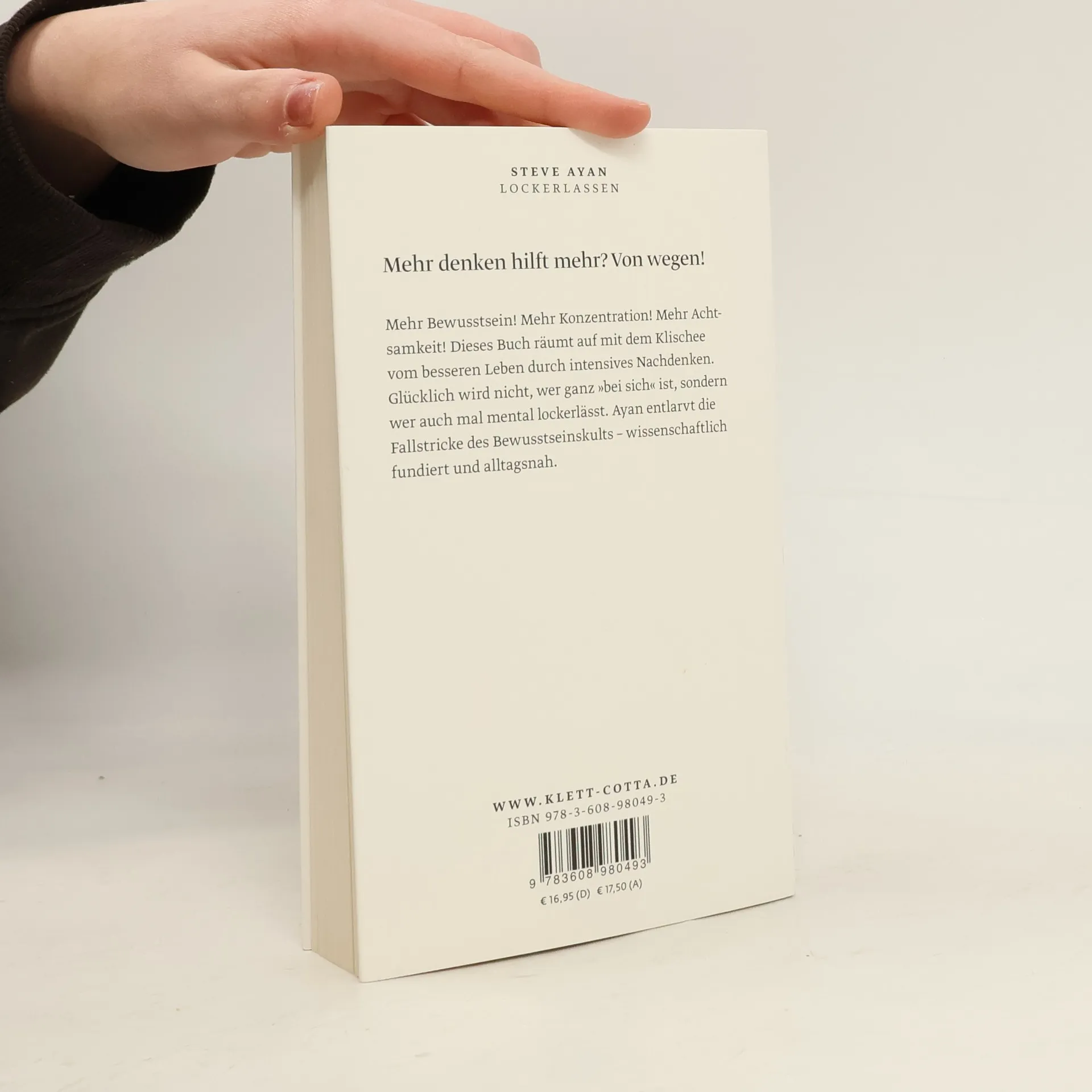 Mehr Bewusstsein! Mehr Denken! Mehr Achtsamkeit! Dieses Buch räumt auf mit dem Klischee vom besseren Leben durch intensives Nachdenken. Glücklich wird nicht, wer ganz »bei sich« ist, sondern wer auch mal mental lockerlässt. Es entlarvt die Fallstricke des Bewusstseinskults – wissenschaftlich fundiert und alltagsnah. Der »Bewusstseinsfimmel« ist das Leiden unserer Zeit. Viele Menschen versuchen, ihr wahres Ich zu ergründen – und sind damit überfordert. Denn die ständige Selbstaufmerksamkeit fördert Grübelei, Ängste und Unruhe. Anhand zahlreicher Studien von Psychologen und Hirnforschern schildert Ayan anschaulich und unterhaltsam, weshalb das Motto »mehr hilft mehr« beim Denken auf den Holzweg führt: Zu viel Bemühen und Konzentration auf das Ich lässt uns schlechter entscheiden, steht beim Lernen und Problemlösen im Weg und macht anfälliger für Stress. Dieses Buch zeigt, wo die größten Denkfallen lauern und wie man sie vermeidet. Momente, in denen man die Seele baumeln lässt, sind dafür unentbehrlich. Denn nur, wenn der Kopf auch mal Pause macht, tut er das, was er am besten kann: neue Ideen sprudeln lassen.