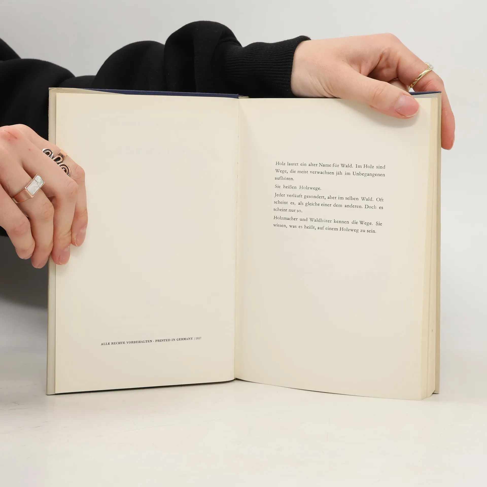 Die 1949/50 erstmals veröffentlichte Sammlung von sechs Abhandlungen aus dem Zeitraum von 1936 bis 1946 vereinigt so Entscheidendes wie Heideggers Frage nach dem Wesen der Kunst („Der Ursprung des Kunstwerkes“, 1935/36), den Aufweis der Grundlegung des neuzeitlichen Weltbildes durch die Metaphysik („Die Zeit des Weltbildes“, 1938), eine Auslegung von Hegels spekulativem Begriff der Erfahrung in der Phänomenologie des Geistes („Hegels Begriff der Erfahrung“, 1942/43), die Zusammenfassung seiner großen Nietzsche-Interpretationen („Nietzsches Wort Gott ist tot“, 1943), sein Gespräch mit der Dichtung Rilkes („Wozu Dichter“, 1946) und seine Deutung des Vorsokratikers Anaximander („Der Spruch des Anaximander“, 1946). In den in diesem Band versammelten sechs Abhandlungen werden von Heidegger einzelne Fragen aus dem Gefüge des seinsgeschichtlichen Denkens, dessen erste Durchgestaltung in den „Beiträgen zur Philosophie (Vom Ereignis)“ (1936-38) als Band 65 der Gesamtausgabe vorliegt, herausgehoben und entfaltet. Die Einzelausgabe der „Holzwege“ gibt seit der siebten Auflage den vollständigen Text der Gesamtausgabe einschließlich der Marginalien Heideggers wieder. Der Band ist somit wort- und seitengleich mit Band 5 der Gesamtausgabe.