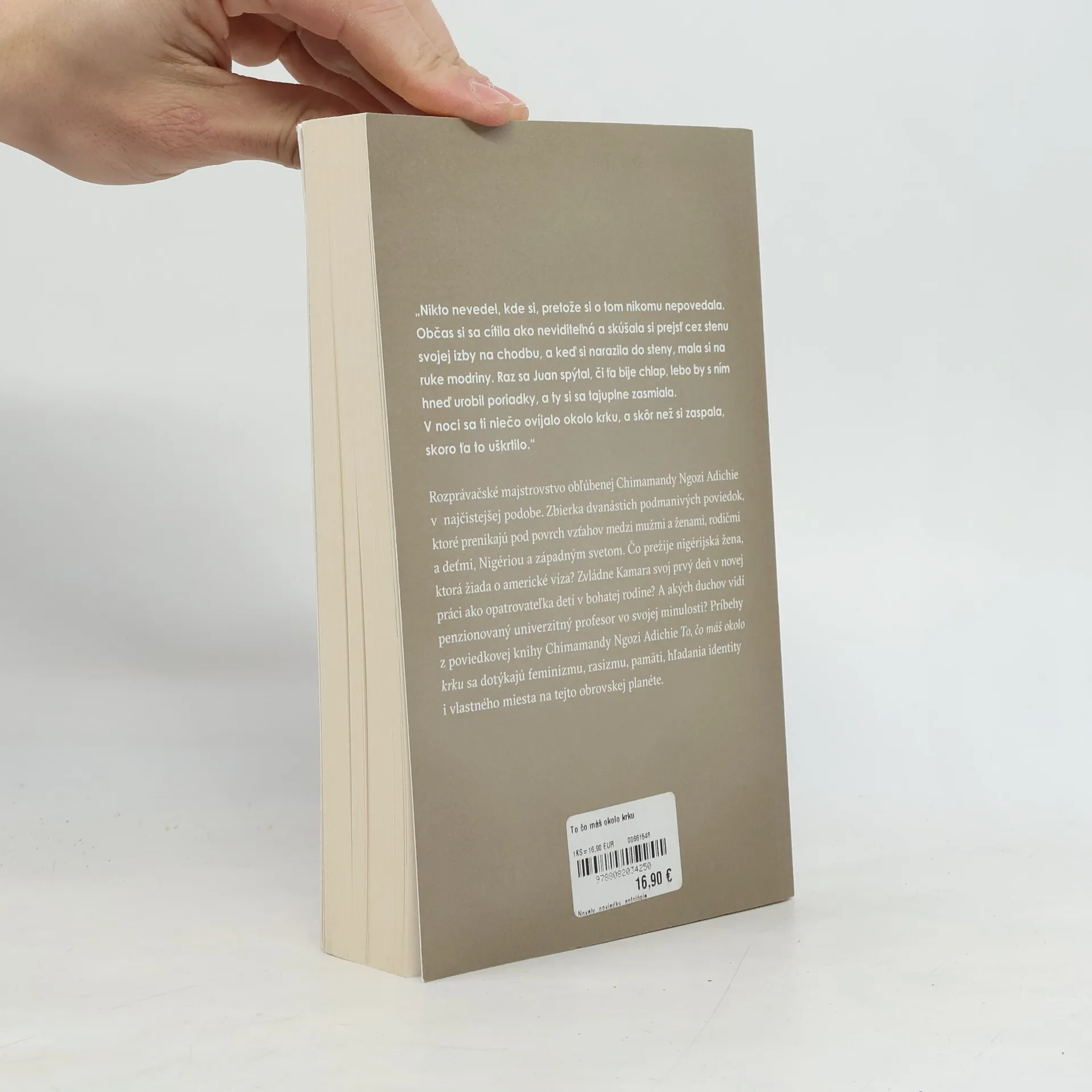 Dojemné i angažované poviedky obľúbenej Chimamandy Ngozi Adichie prenikajú pod povrch vzťahov medzi mužmi a ženami, rodičmi a deťmi, ale aj Nigériou a západným svetom. Táto kniha predstavuje jej rozprávačské majstrovstvo v tej najčistejšej podobe!To, čo máš okolo krku je zbierka dvanástich vybrúsených poviedok Chimamandy Ngozi Adichie, v ktorých sa stretávajú a prepletajú nielen malé ľudské osudy, ale aj veľké dejiny či rôzne kultúry. Sú to texty presiaknuté krásou, smútkom i túžbou, ale aj osamelosťou a čírou ľudskou beznádejou.Čo prežije nigérijská žena, ktorá žiada o americké víza? Zvládne Kamara po príchode do Ameriky prácu opatrovateľky detí v bohatej rodine? Akých duchov vidí penzionovaný univerzitný profesor vo svojej minulosti? A prečo nigérijská mladomanželka v New Yorku rýchlo zistí, že nikdy nebude schopná vzdať sa svojej identity?Príbehy z poviedkovej zbierky Chimamandy Ngozi Adichie To, čo máš okolo krku sa zaoberajú témami feminizmu, rasizmu, pamäti, spoločenských rozdielov, sexuálneho obťažovania, náboženského porozumenia, hľadania a strácania identity i vlastného miesta na tejto obrovskej planéte. No popri všetkých tých dôležitých témach v rukách držíme predovšetkým výnimočnú literatúru.Poviedková kniha To, čo máš okolo krku od obľúbenej a oceňovanej nigérijskej spisovateľky Chimamandy Ngozi Adichie vychádza v preklade Kristíny Karabovej.