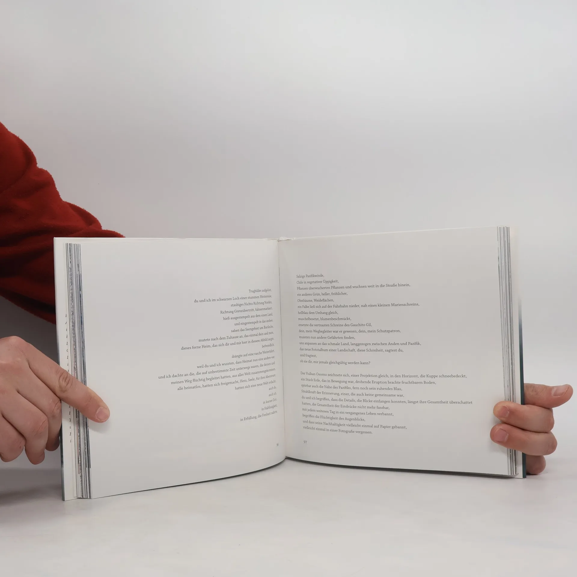 Ein Wir auf einer Reise, die durch Argentinien und Chile führt, in Stadtkulissen, Wüstenlandschaften, bis ans Ende der Welt, Mythen und Legenden streift, Begegnungen und Geschichte erzählt. Das Wir in stetiger Veränderung, in Sehnsuchtsmomenten und Erwartungshaltungen gefangen, getrieben in einer Fremde, die es spaltet und wiedervereint, einer vertrauten Fremde, die verborgene Wünsche, Ungesagtes und bislang nur Erahntes zum Vorschein bringt. Eine Liebesgeschichte, dargestellt in Text und Bild, die sich in Gleichklang und Widerspruch manifestiert, im Freiheitsgedanken des Augenblicks und im gelebten Moment.