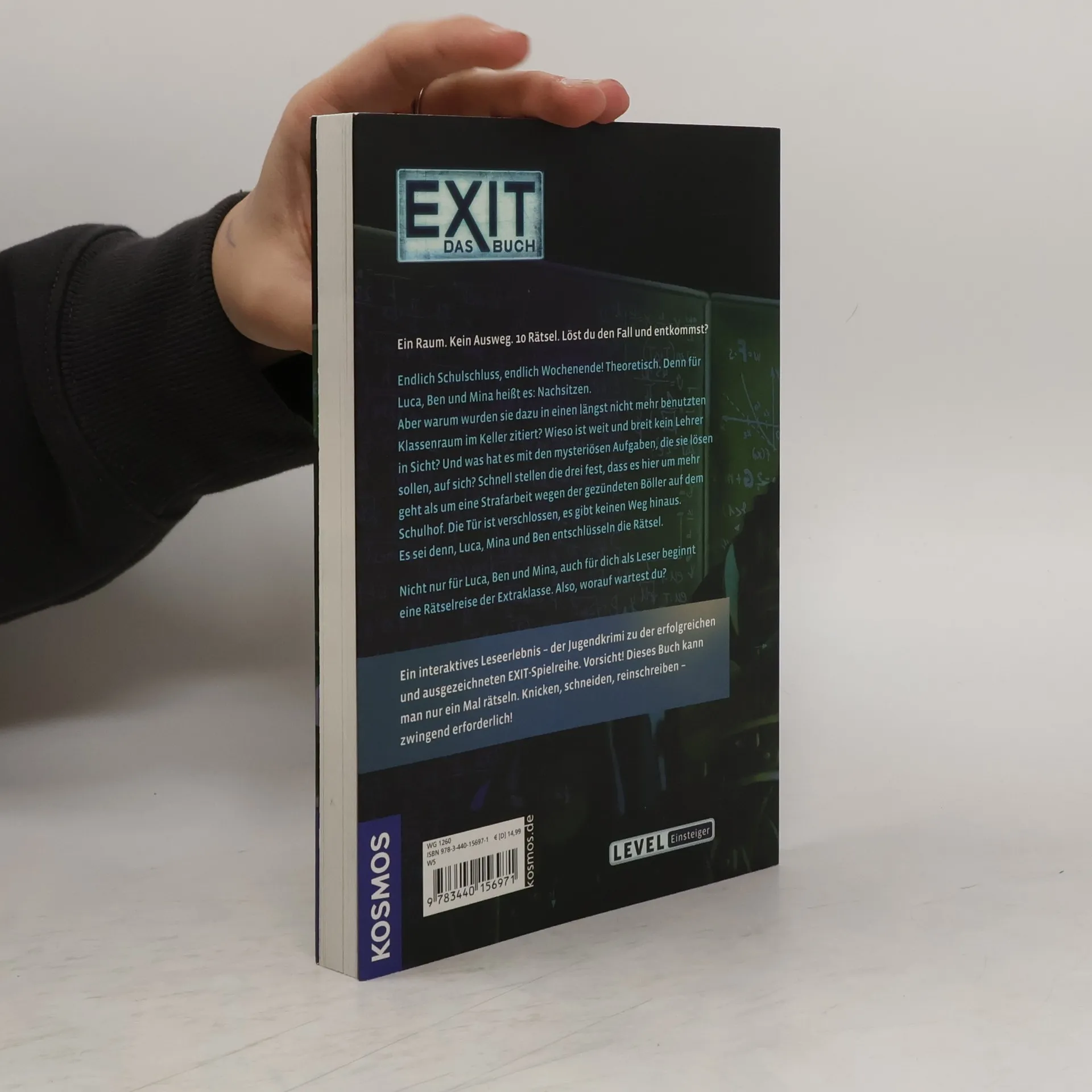 Die EXIT®-Bücher bieten eine einzigartige Kombination aus Rätselspaß und Lesevergnügen und sorgen für spannendes Live-Escape-Feeling für zu Hause. Löst knifflige Rätsel und versucht, so schnell wie möglich zu entkommen! Freitagnachmittag und Schulschluss. Doch nicht für Luca, Ben und Mina. Sie müssen nachsitzen, seltsamerweise in Raum U1 im Keller des Leonardo-da-Vinci-Gymnasiums. Von Lehrern keine Spur, nur ein Zettel, der sie auffordert, die Aufgabe an der Tafel zu lösen. Mina hat keinen Bock auf dieses verstaubte Loch mit dem flackernden Licht an der Decke. Sie will gehen – doch die Tür ist verschlossen! Jetzt beginnt für die drei Freunde eine Rätselreise der Extraklasse. Wer steckt hinter dem Ganzen? Das herauszufinden, ist die Aufgabe des Lesers. Er muss die Rätsel lösen, um zu erfahren, auf welcher Seite die Geschichte weitergeht. Hinweise können überall versteckt sein, kreative Lösungen sind gefragt, ausschneiden, zeichnen, knicken – alles ist erlaubt. Und die Zeit läuft ...